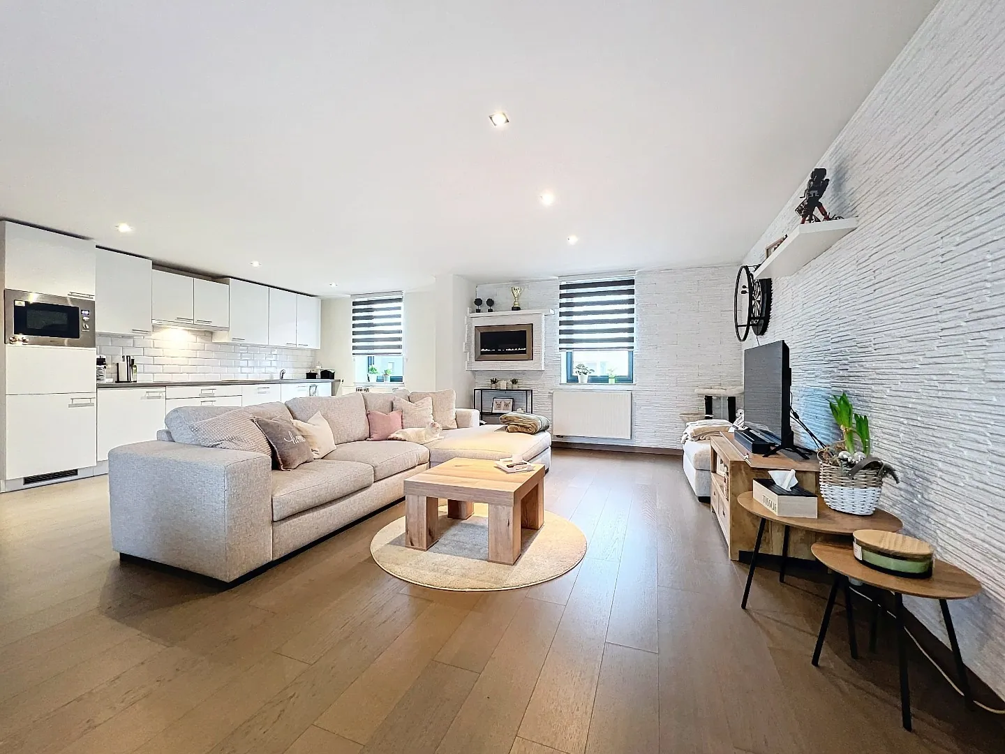 Indeling: Inkom/gang met vestiairekast, ruime en lichtrijke woonkamer met plaats voor salon en eetkamer, ingerichte open keuken met aangrenzend een praktische berging, twee slaapkamers (één heel grote en één kleine), een ingerichte badkamer en een apart toilet. Ruim (+/- 25m²) zuidgericht terras aanwezig waar het aangenaam vertoeven is.