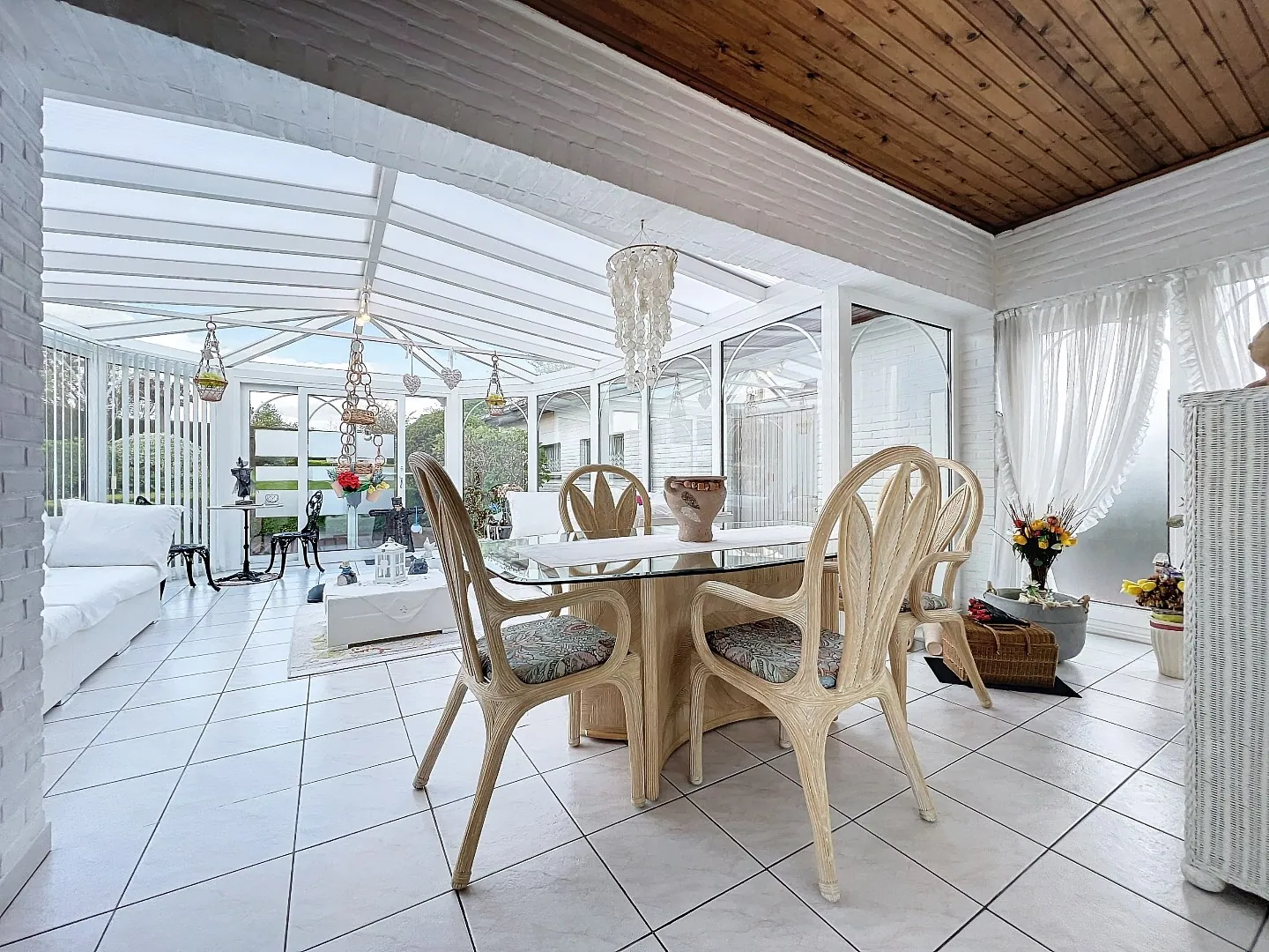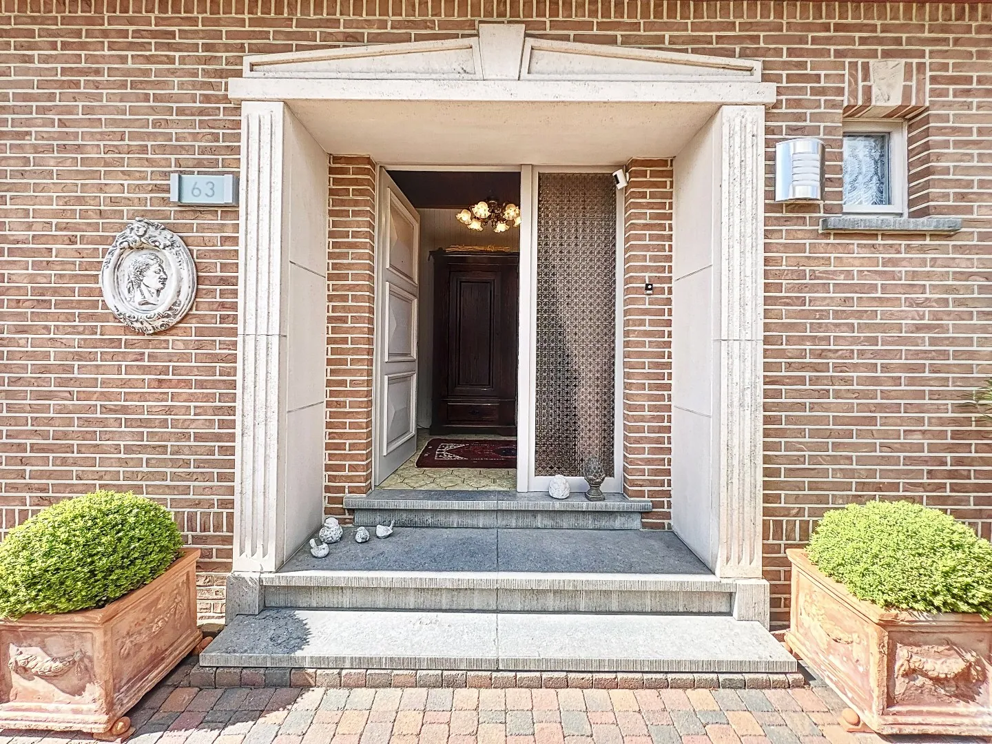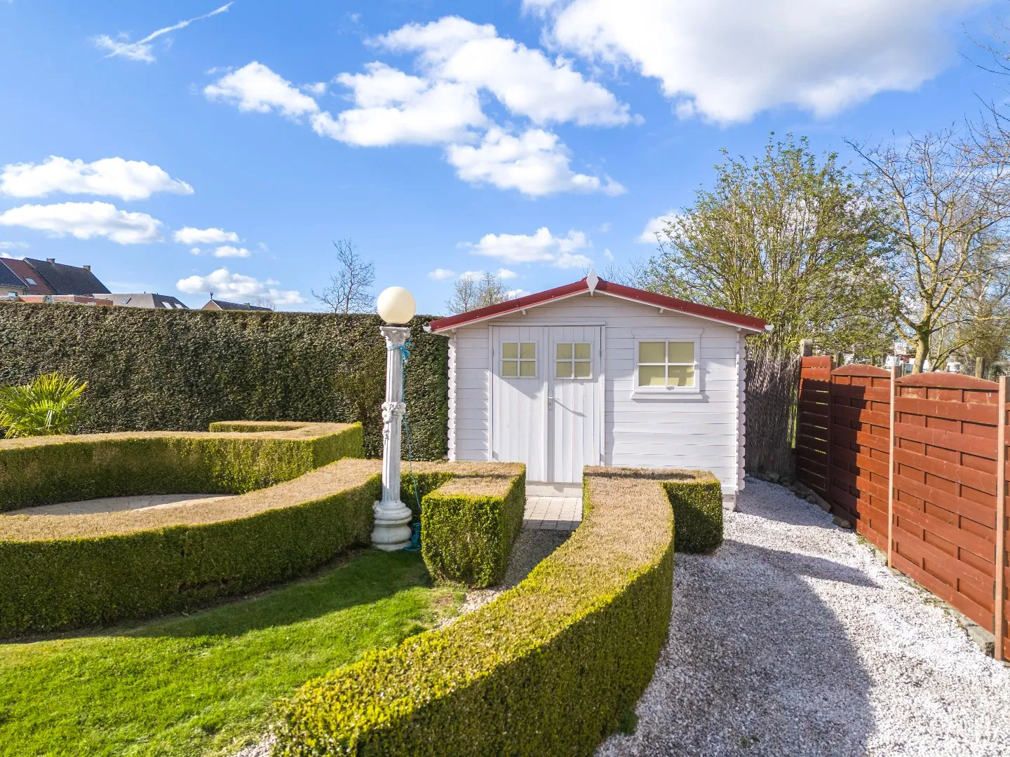 Indeling: inkom, gastentoilet, aangename en lichtrijke woonkamer, ruime ingerichte keuken met aangrenzend een praktische berging (voor oa. wasmachine en droogkast), gang die toegang biedt tot 3 slaapkamers, de badkamer (meubel, ligbad met douchewand en toilet) en de veranda. Kelder (ter hoogte van keuken) en zolder aanwezig. Oprit voor enkele wagens en een ruime, aparte garage voor 1 wagen. Voortuin en fraai aangelegde achtertuin met recent tuinhuis. Terras ter hoogte van de keuken met een zonneluifel.