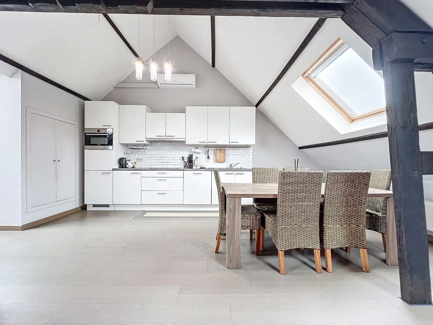 Het appartement is gelegen op de tweede verdieping van een kleinschalige residentie bestaande uit 4 entiteiten. Het werd voor het eerst bewoond in 2013 én werd afgewerkt met kwalitatieve en warme materialen. De leefruimtes werden afgewerkt tot in de nok van het dak, wat een ruim en authentiek gevoel geeft. Aankoopverplichting van een bijhorende kelderberging en private garage ten bedrage van € 23.000. Geen lift aanwezig.