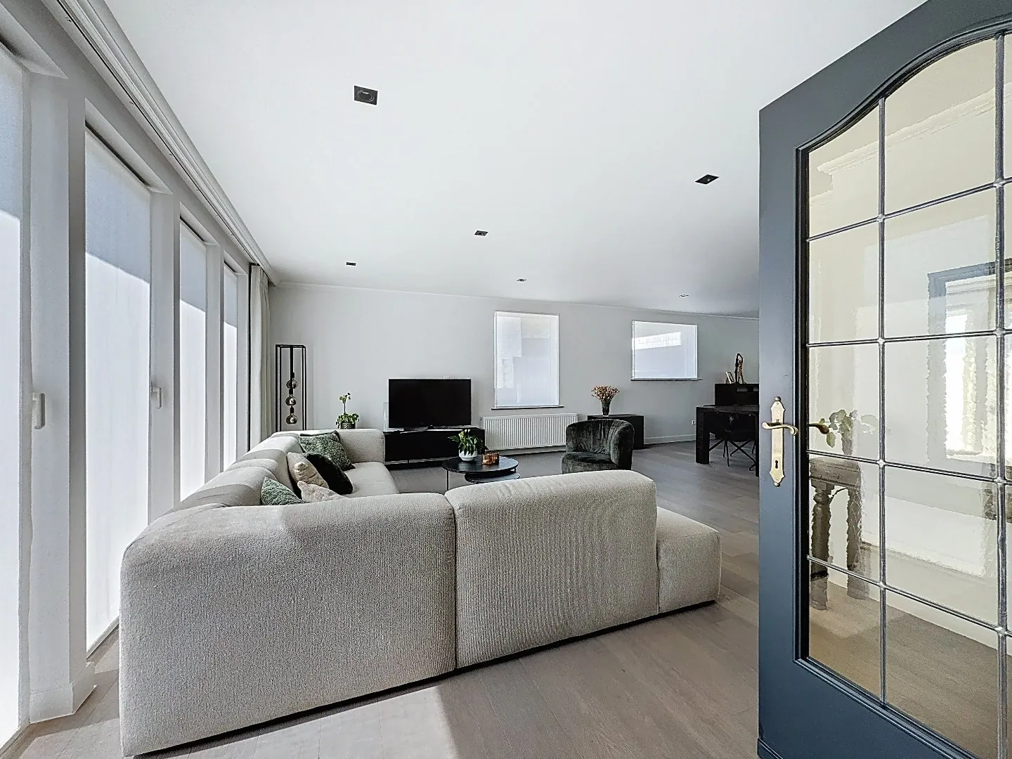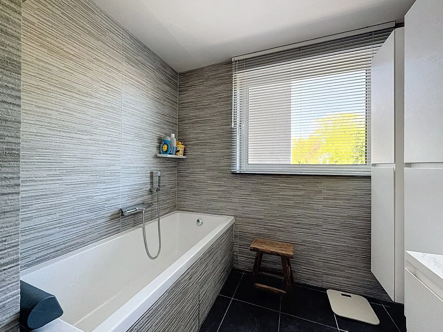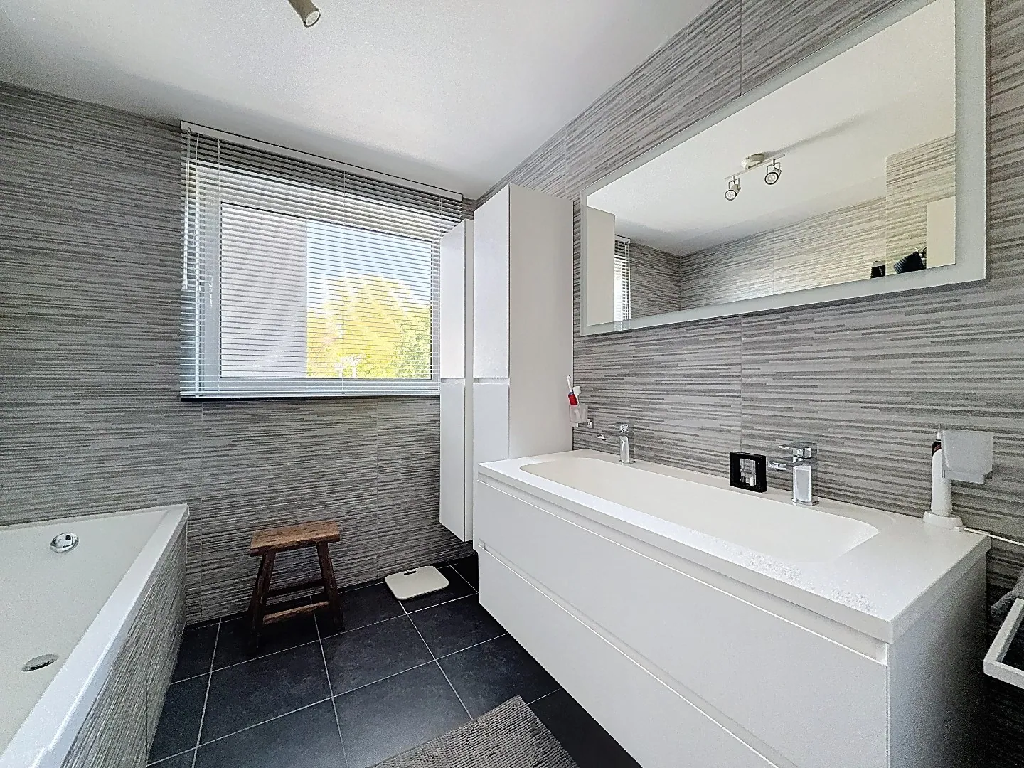 Indeling: gelijkvloers: inkom met toilet en toegang naar berging (technische ruimte, was/droogkast, fietsen, ...), zeer ruime en aangename leefruimte/eetplaats in parket, aansluitend halfopen keuken met zicht op de tuin, badkamer met bad en strak meubilair, slaapkamer, vestiaire met ingebouwde schoenkast.