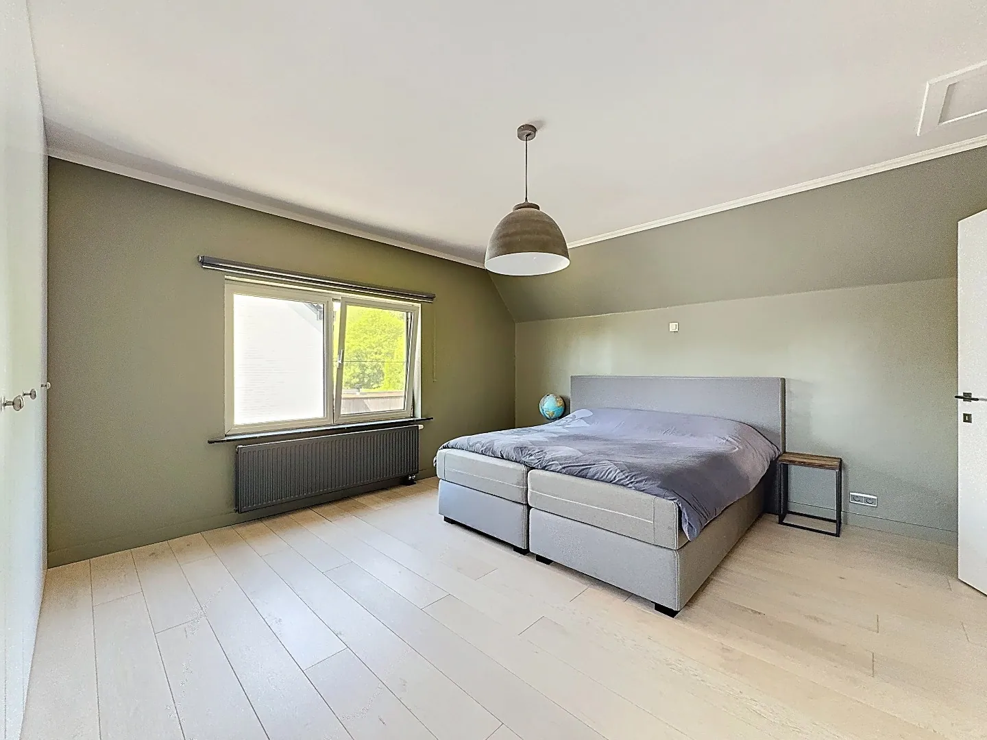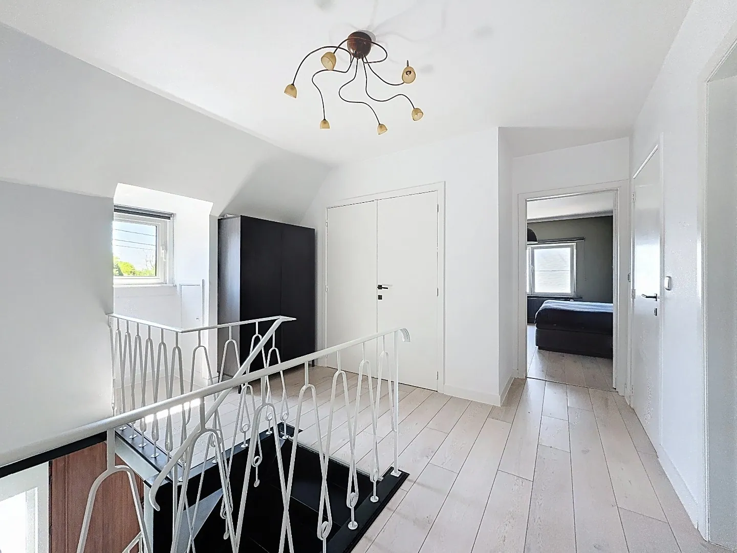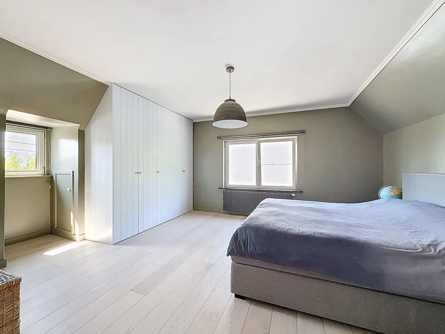 Eerste verdieping: master bedroom met ingebouwde kast, derde slaapkamer, afzonderlijk toilet en doucheruimte met lavabo. Verder ook tal van opbergruimtes.