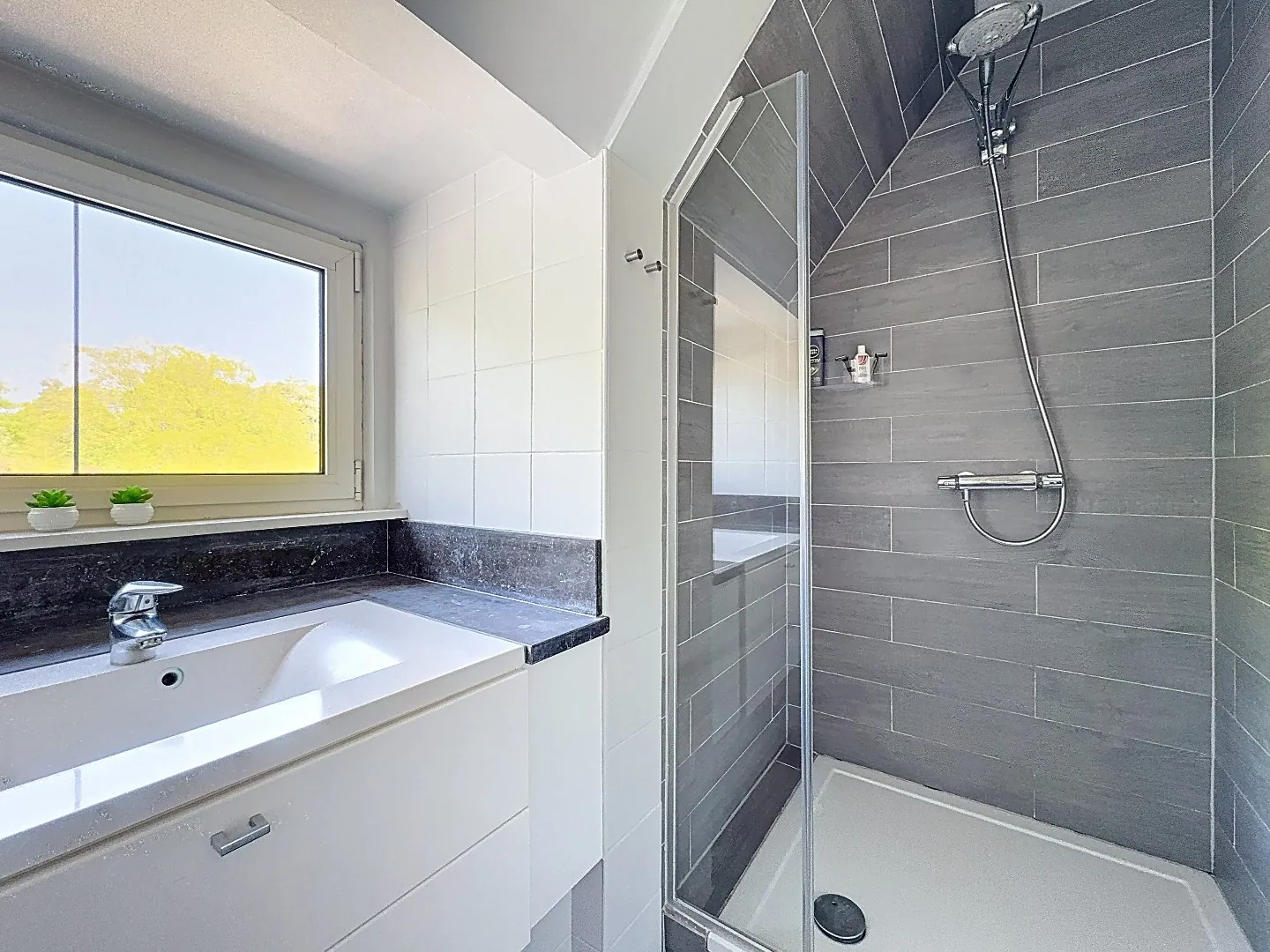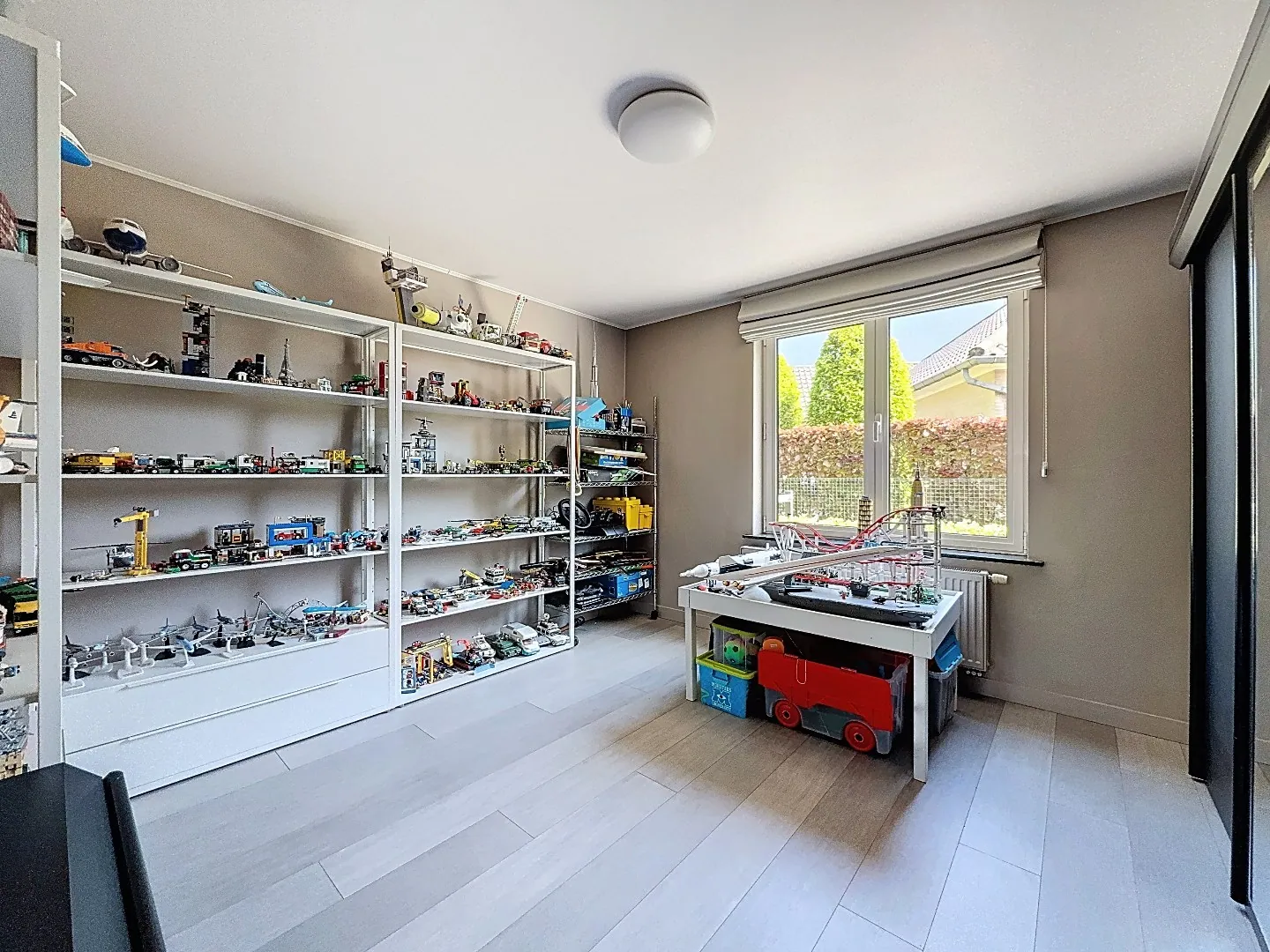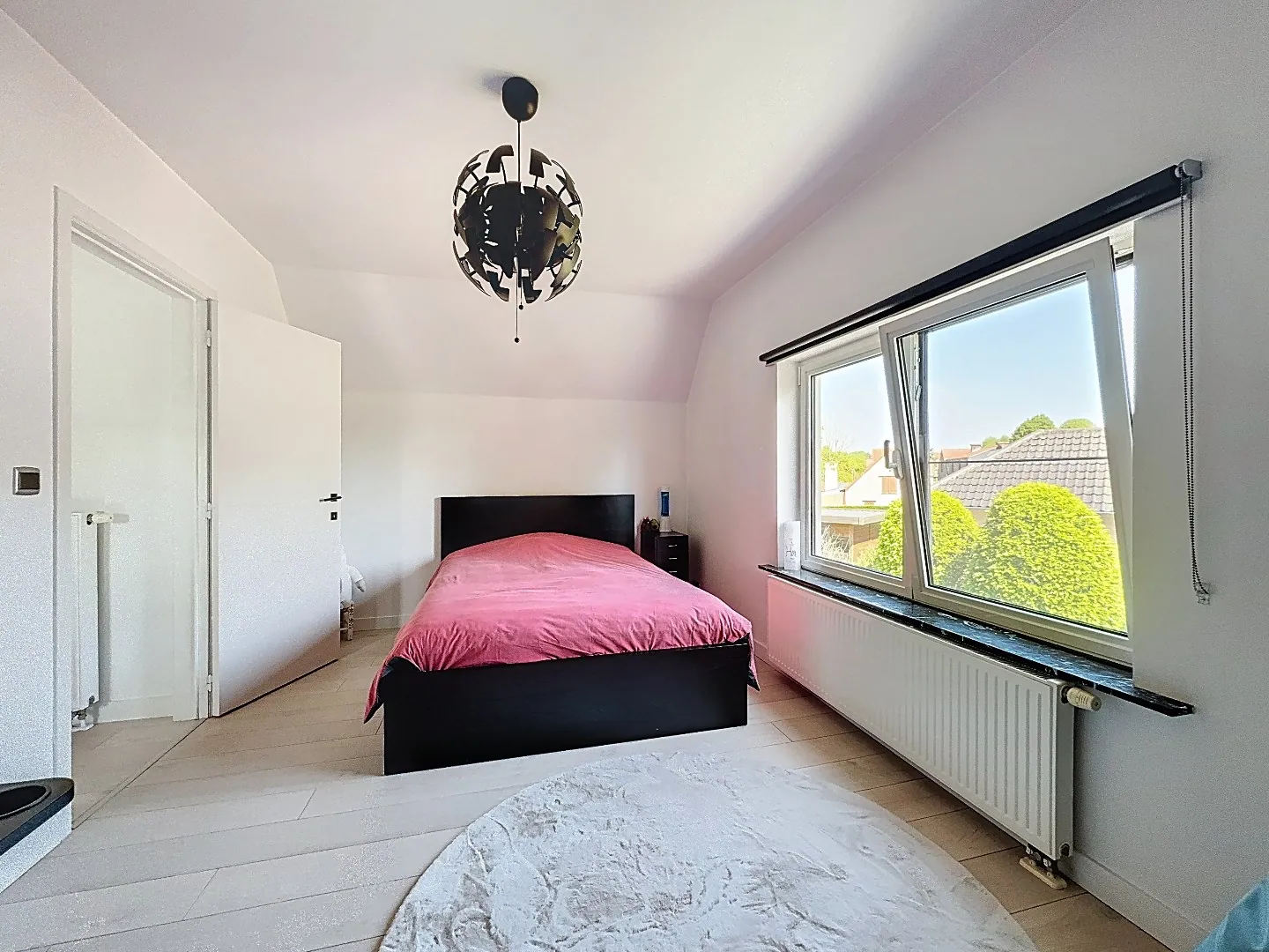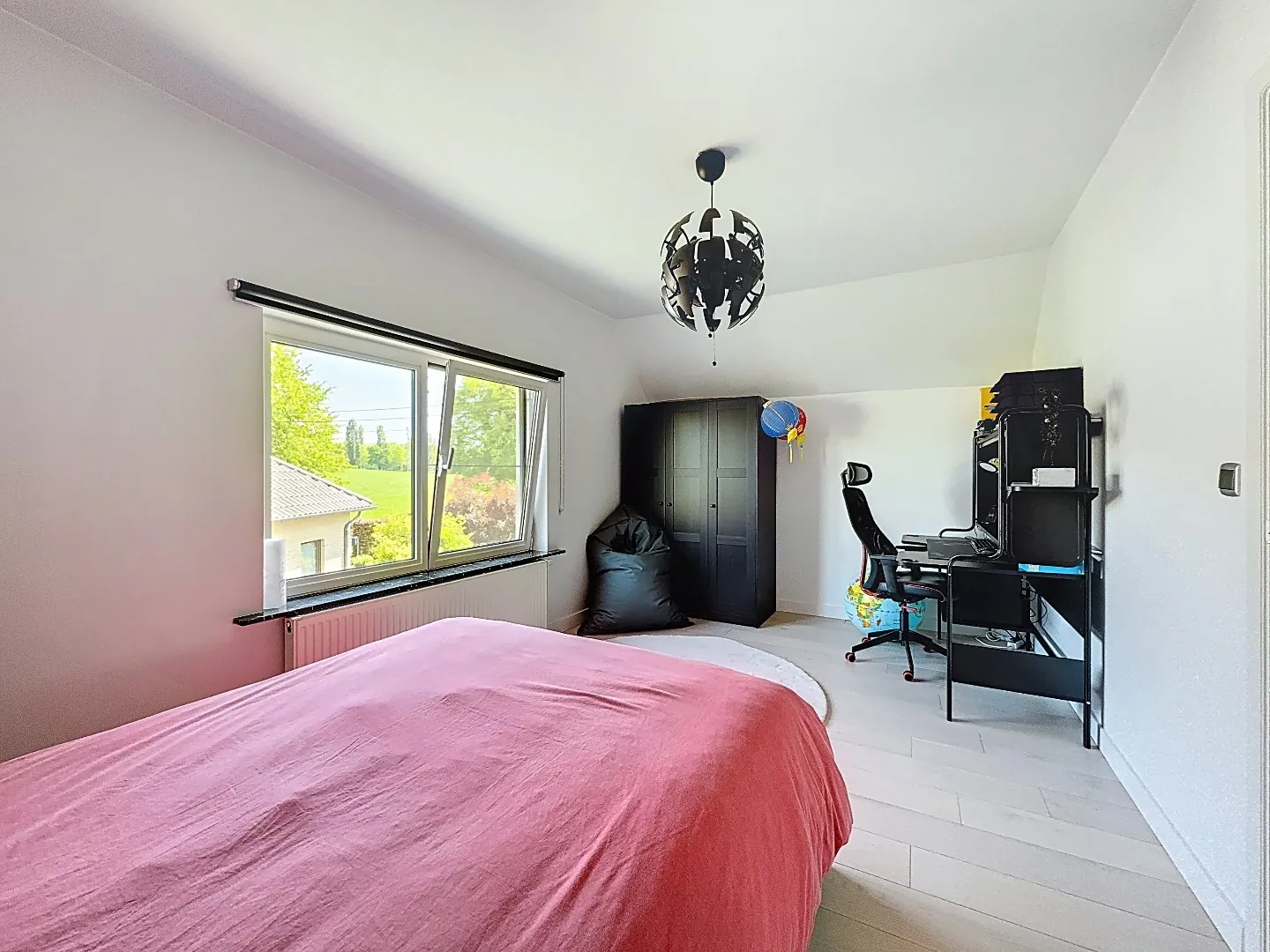 Eerste verdieping: master bedroom met ingebouwde kast, derde slaapkamer, afzonderlijk toilet en doucheruimte met lavabo. Verder ook tal van opbergruimtes.
