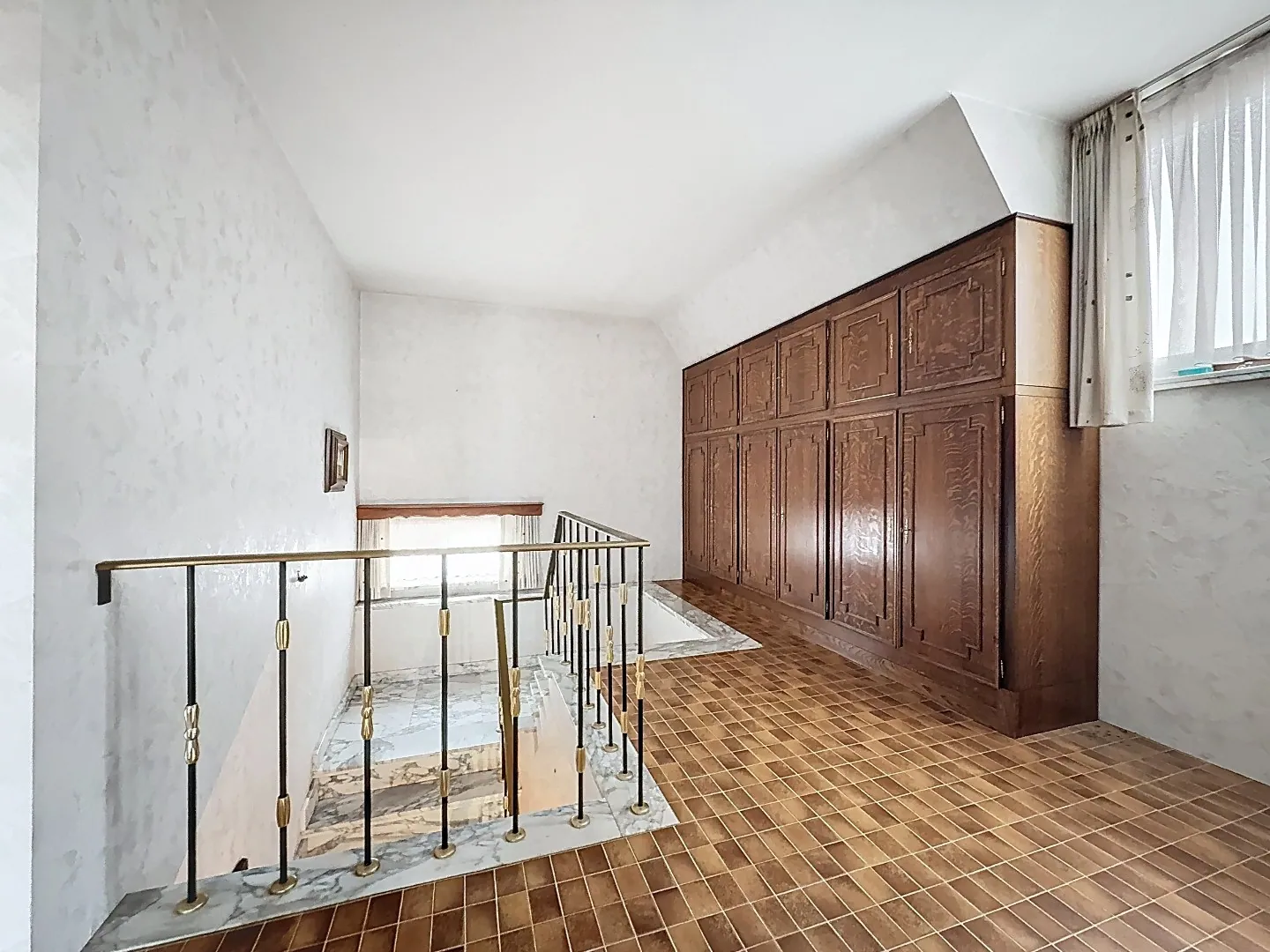 Indeling: inkomhal met mooie natuursteen trap en enkele inbouwkasten (vestiaire), woonkamer met zitput en veel lichtinval, aansluitend een veranda met zicht op de tuin, ruime keuken en een gastentoilet. De verdieping heeft een ruime nachthal met enkele inbouwkasten, drie slaapkamers (2 grote en 1 kleine) en een badkamer. Kelder en zolder aanwezig. De zolder biedt eventueel uitbreidingsmogelijkheden mits plaatsing vaste trap.