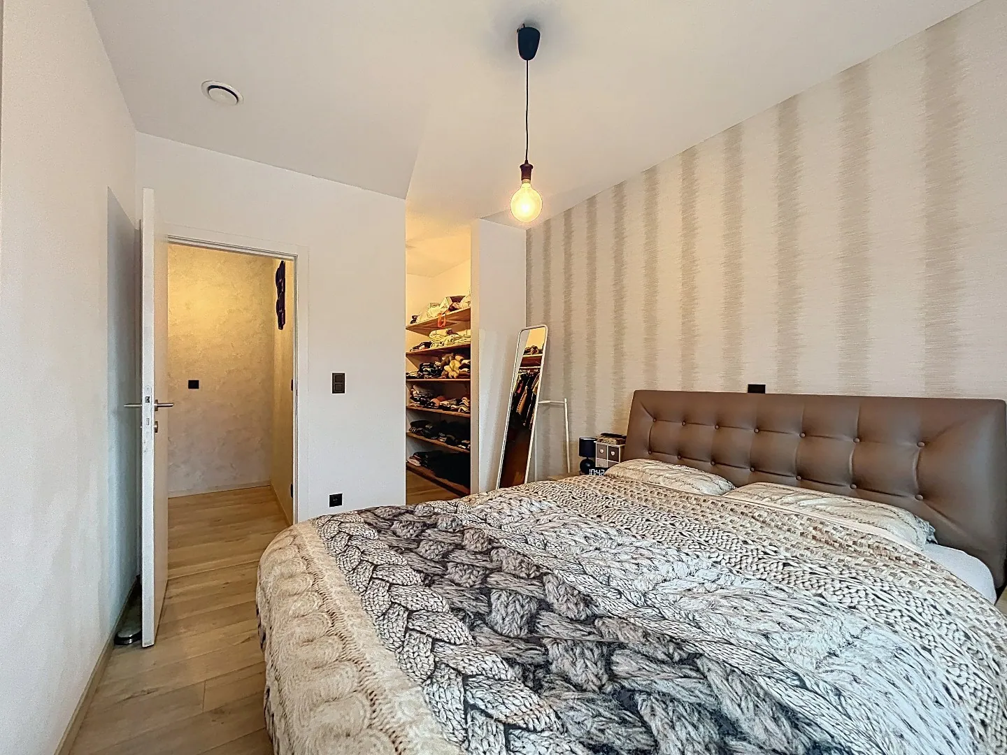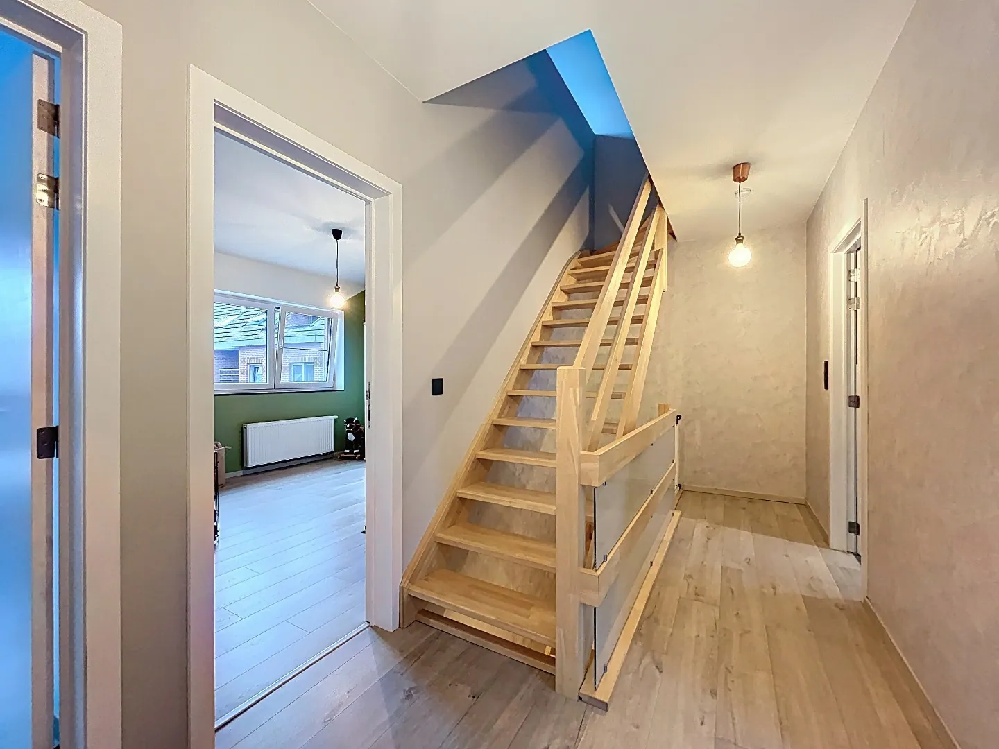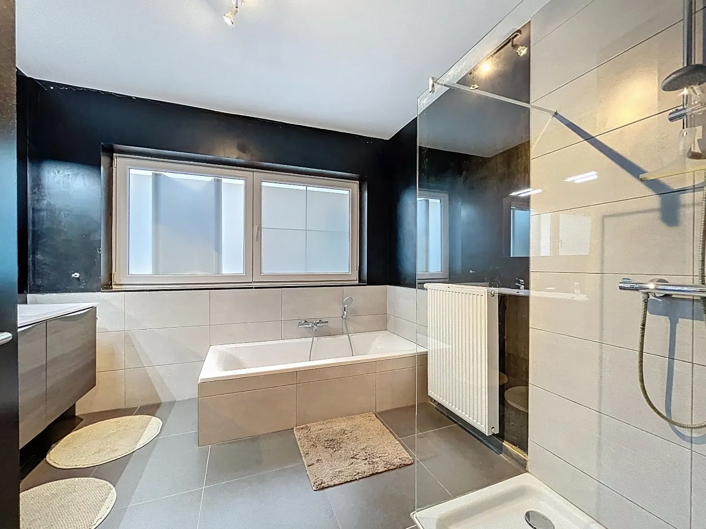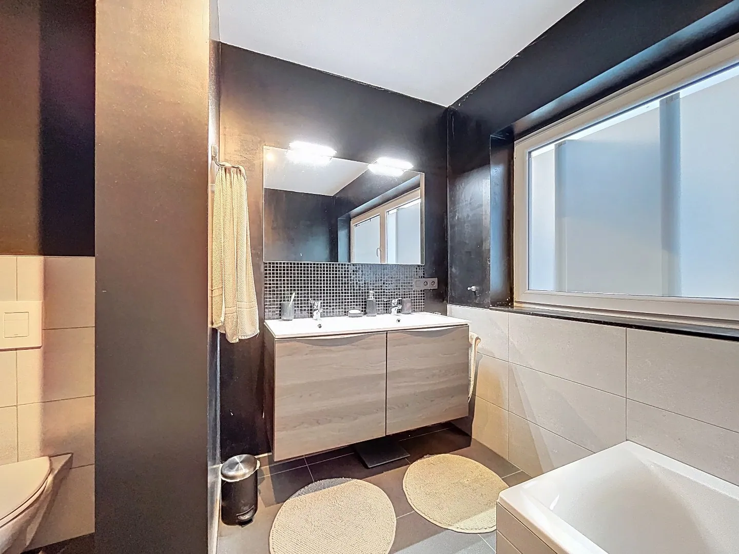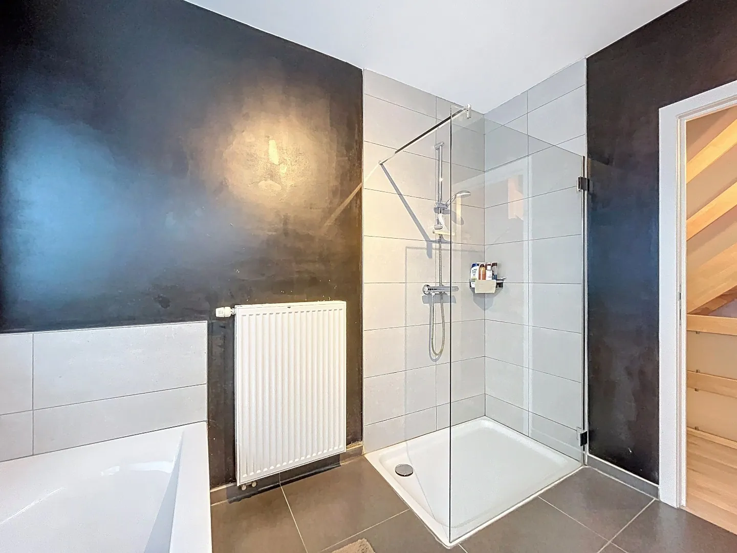 Eerste verdieping: 3 slaapkamers waarvan 1 met aansluitende dressing, badkamer met ligbad, inloopdouche, dubbele lavabo met meubel en toilet.