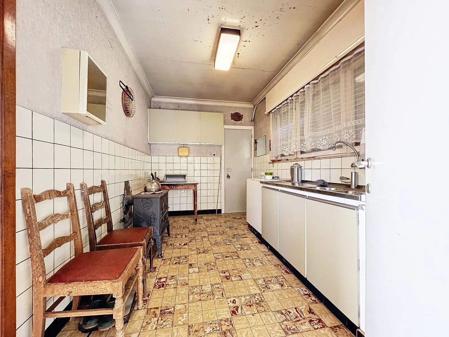 Indeling: het gelijkvloers heeft een inkomhal, woonkamer vooraan, leefruimte achteraan, keuken, berging en toilet. De verdieping heeft een nachthal en telt verder 4 slaapkamers en een kleine badkamer. Zolder aanwezig, toegankelijk via valluik. Kelder aanwezig.