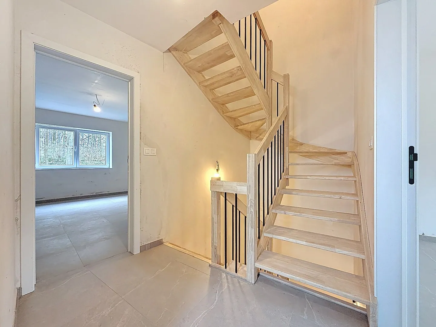 Indeling: Het gelijkvloers bestaat uit een inkom/gang met strakke houten trap in combinatie met zwarte metalen spaken, gastentoilet met handenwasser, lichtrijke woonkamer met groot raam dat uitgeeft op het terras en tuin, ingerichte open keuken (mogelijkheid tot uitbreiding kasten) voorzien van inbouwtoestellen, praktische berging en een ruime garage voor één wagen. De eerste verdieping telt één royale master bedroom en een tweepersoonsslaapkamer, een ingerichte badkamer en een apart toilet. De tweede verdieping beschikt over een nachthal, een tweepersoonsslaapkamers én een zolderruimte.
