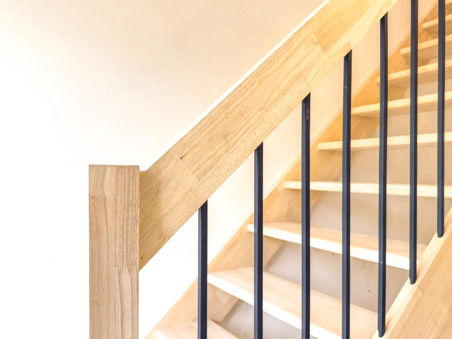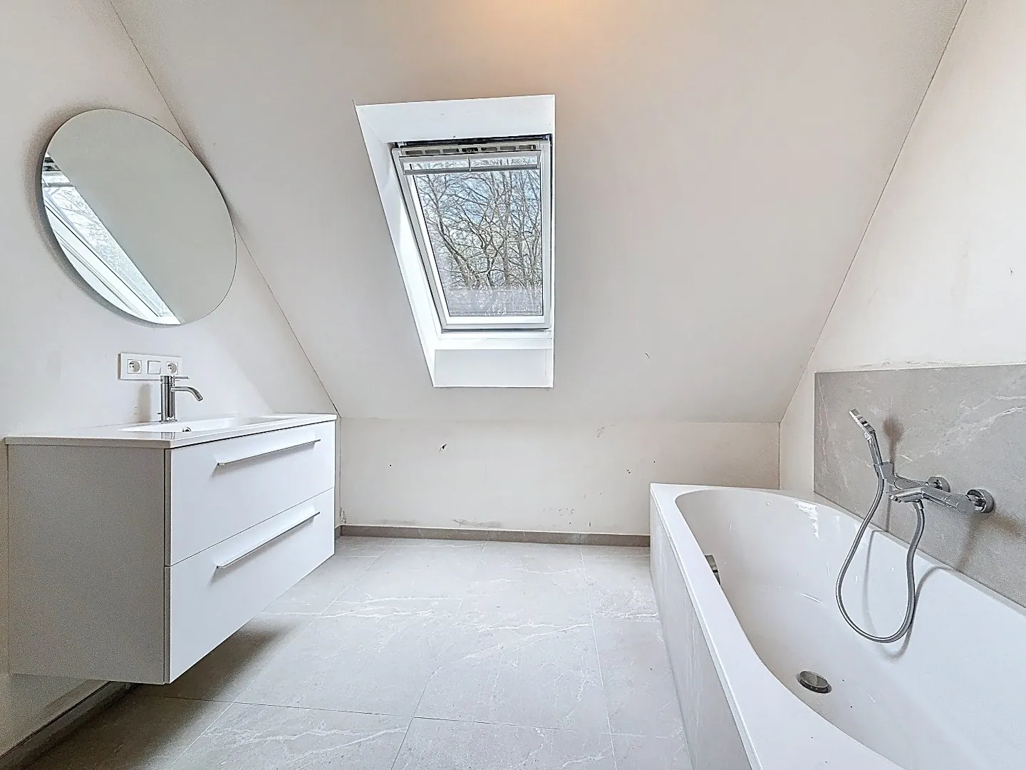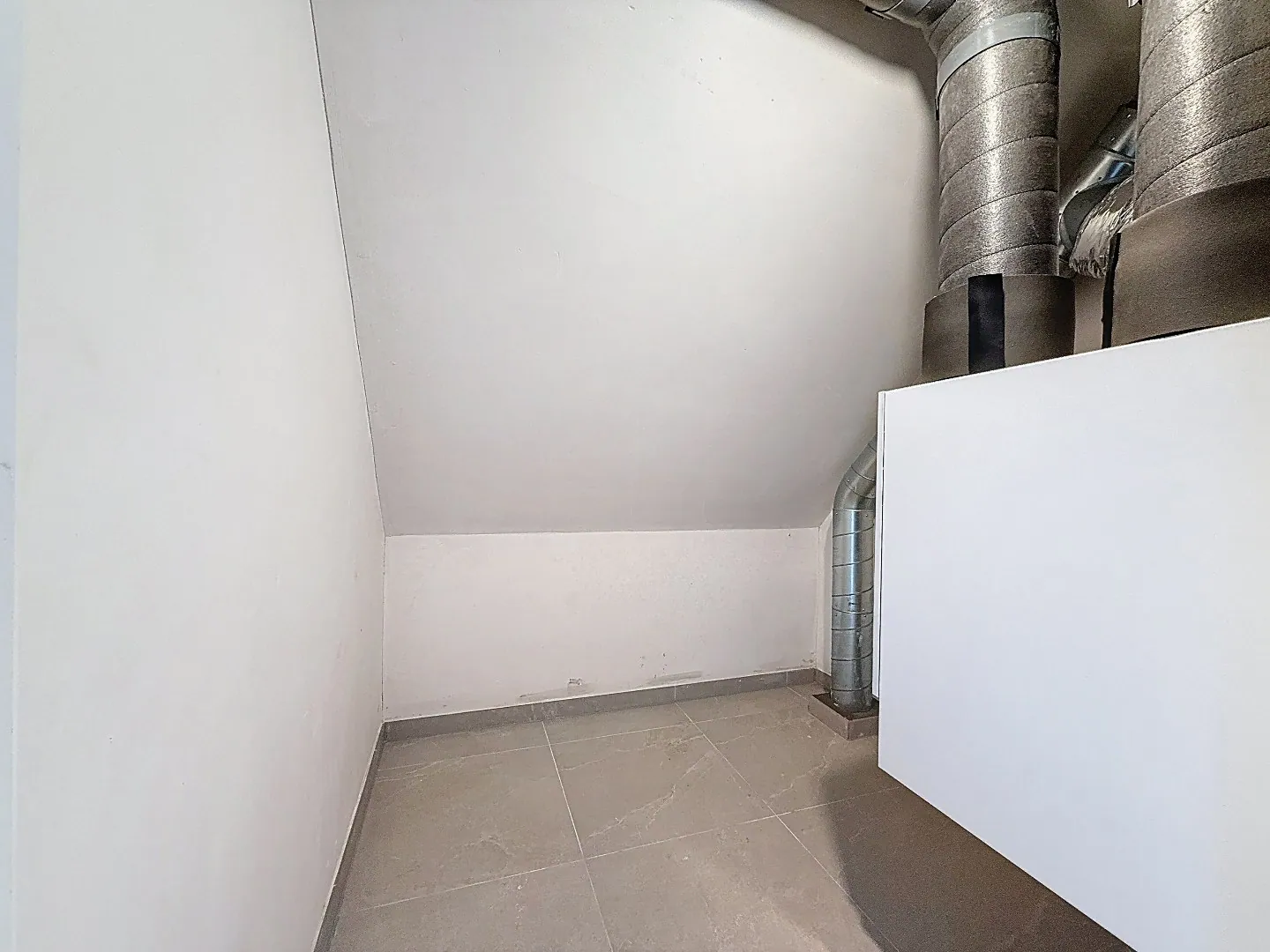 Indeling: Het gelijkvloers bestaat uit een lichtrijke inkomhal met strakke houten trap in combinatie met zwarte metalen spaken, gastentoilet met handenwasser, lichtrijke woonkamer met groot raam dat uitgeeft op het terras en tuin, ingerichte open keuken (mogelijkheid tot uitbreiding keukenmeubilair) voorzien van inbouwtoestellen, praktische berging met toegang tot de garage voor één wagen. De eerste verdieping telt maar liefst drie ruime slaapkamers, een ingerichte badkamer en een apart toilet. De tweede verdieping beschikt over een nachthal, een vierde slaapkamer, een tweede badkamer met toilet en een kleine berging/zolderruimte..