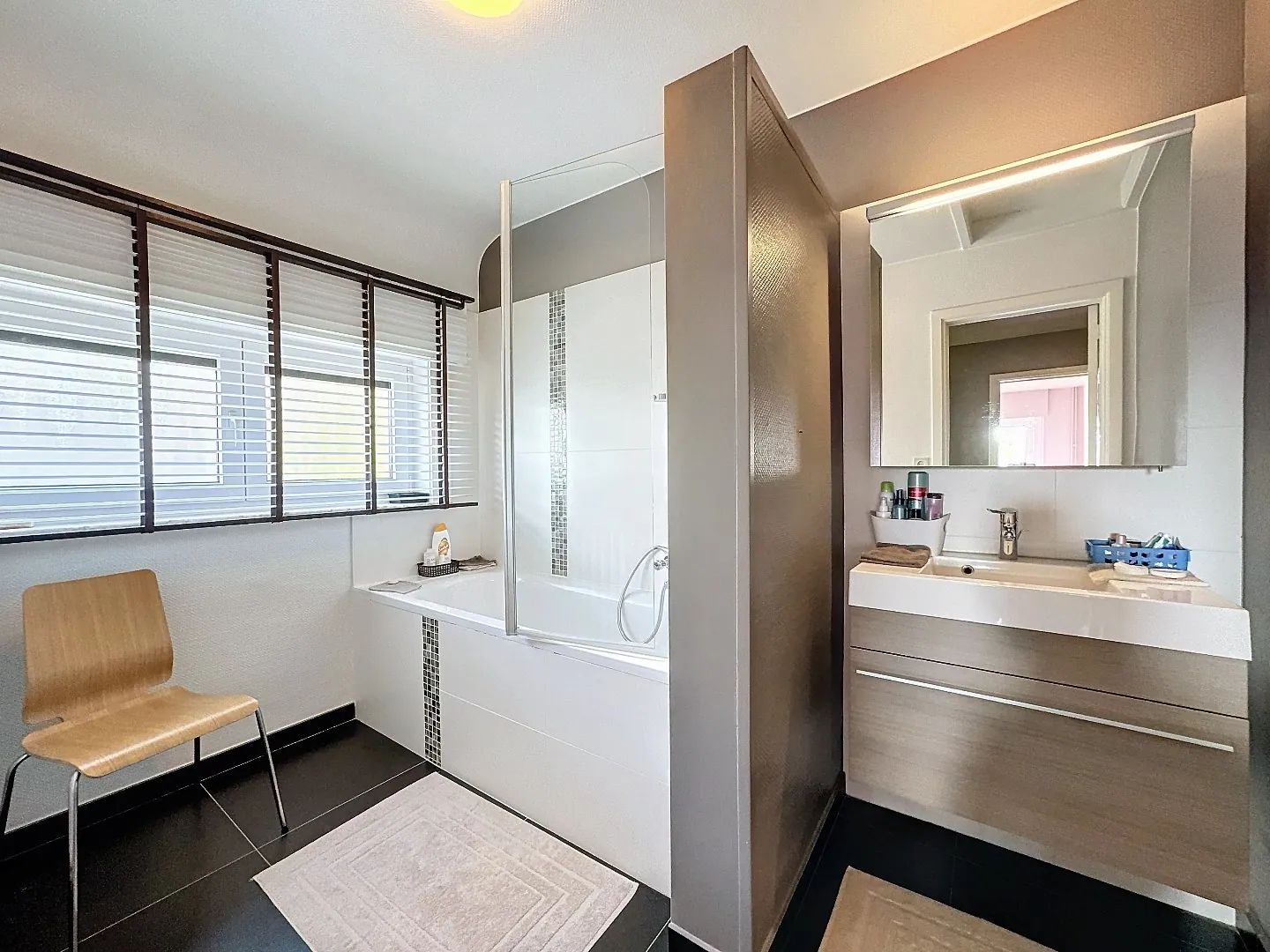 Eerste verdieping: nachthal, 3 slaapkamers, recente badkamer met douchebad en lavabo.