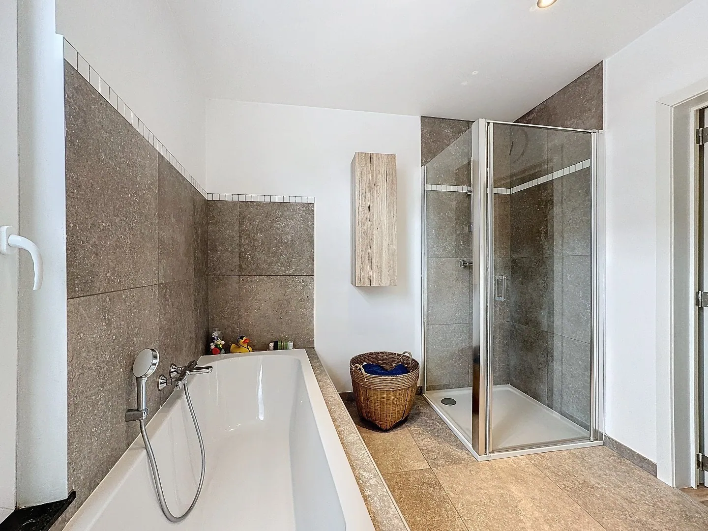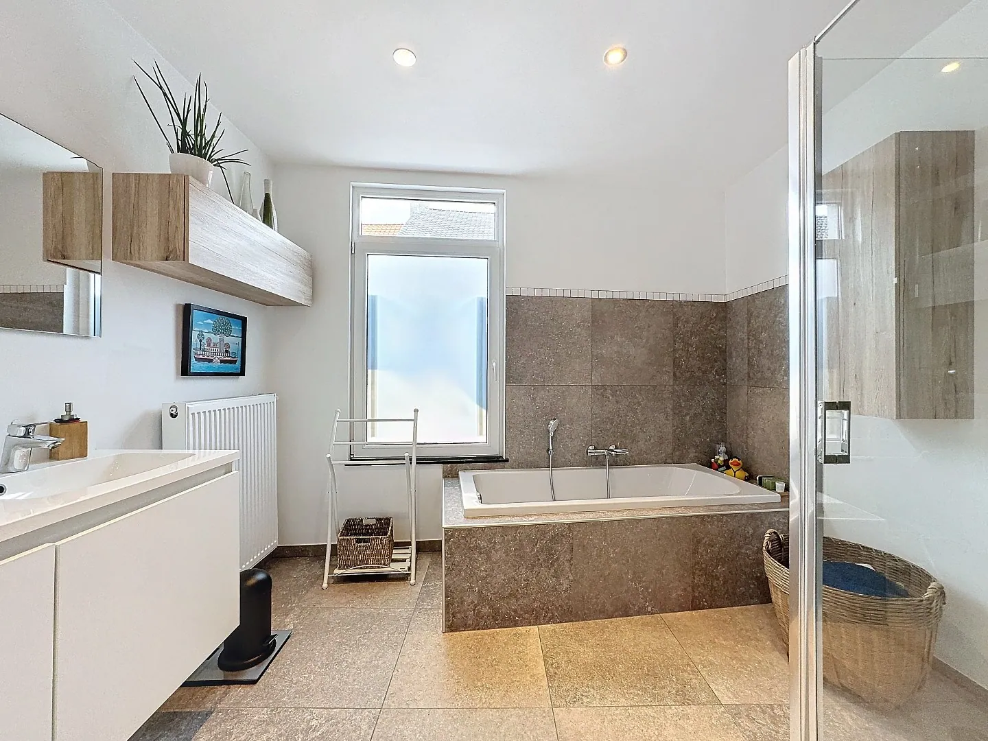 Eerste verdieping: nachthal, 1 slaapkamer, badkamer met ligbad, douchecabine, dubbele lavabo, afzonderlijk toilet, wasplaats.
