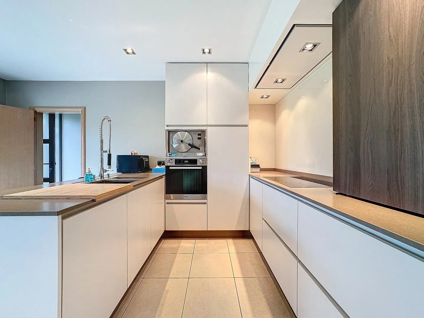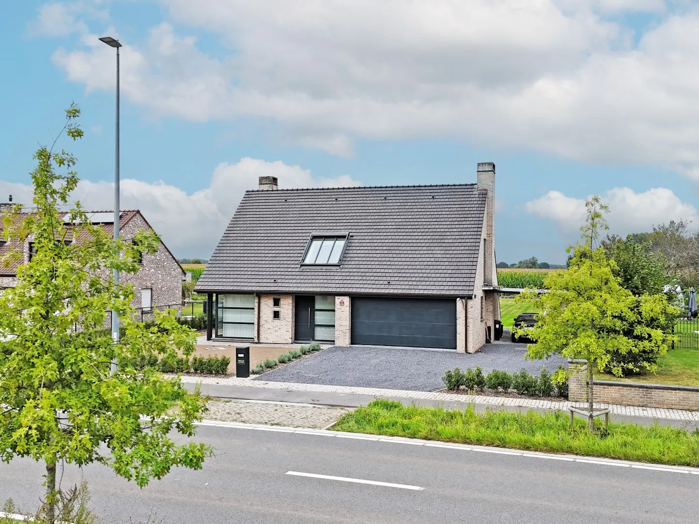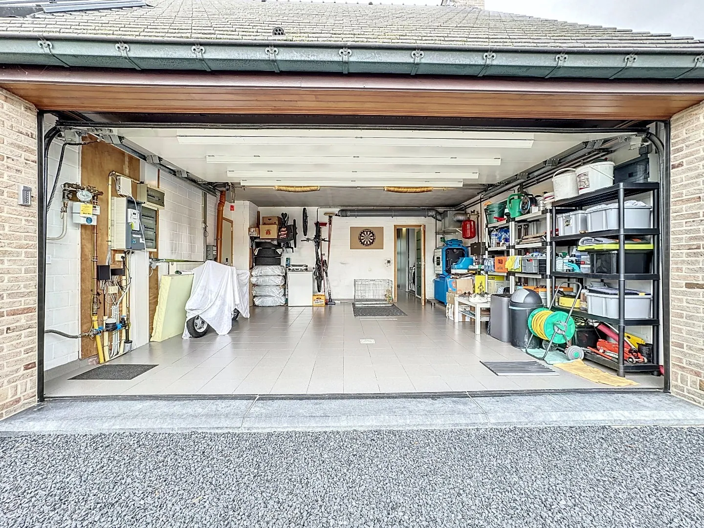 Indeling: inkomhal met gastentoilet, afzonderlijke bureauruimte, zeer gezellige leefruimte met mooie gashaard en eetplaats, hyper geïnstalleerde keuken (Miele toestellen, stoomoven, industriële dampkap, ...), wasplaats/berging met ingemaakte kasten en douchecabine, dubbele garage met automatische sectionale poort, prefab kelder.