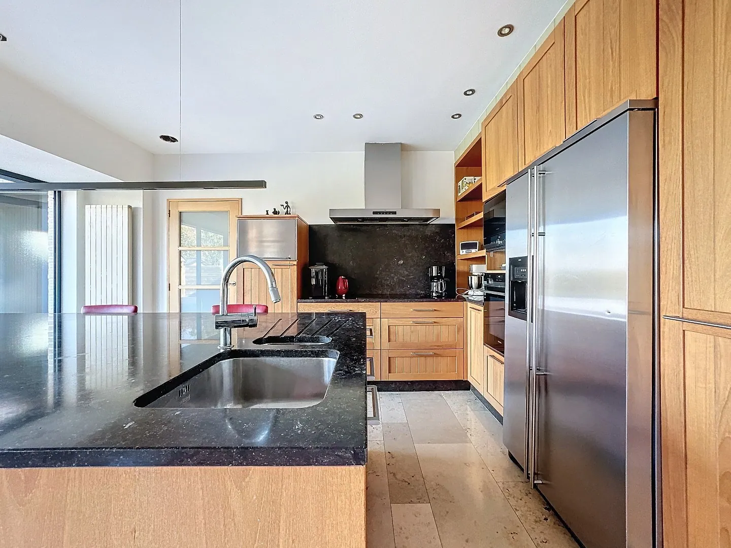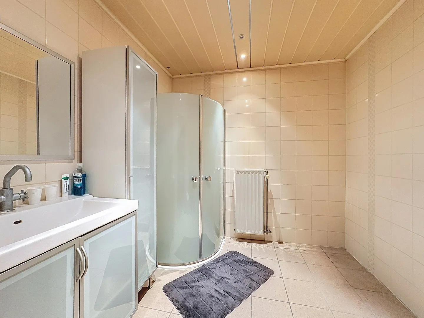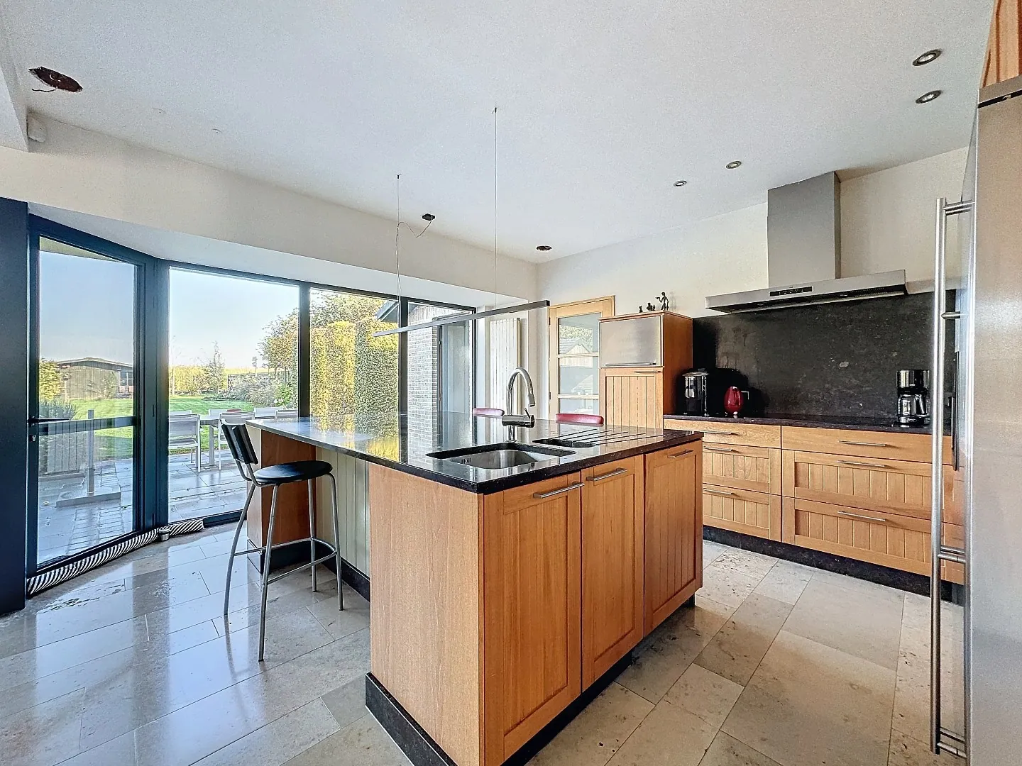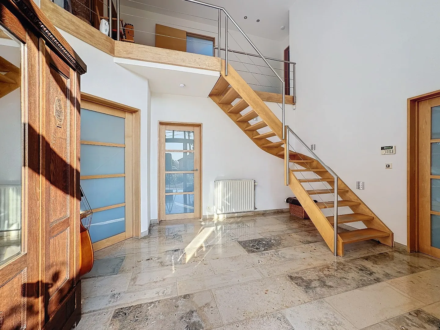 Indeling: grote inkomhal met vide, gastentoilet, zeer gezellige leefruimte met houtkachel en aansluitende eetplaats, geïnstalleerde keuken met eiland, wasplaats/berging, koele berging, douchekamer met lavabo, afzonderlijke bureauruimte van +/- 25m² (voorheen ingericht als kapsalon, waterleidingen nog aanwezig!).