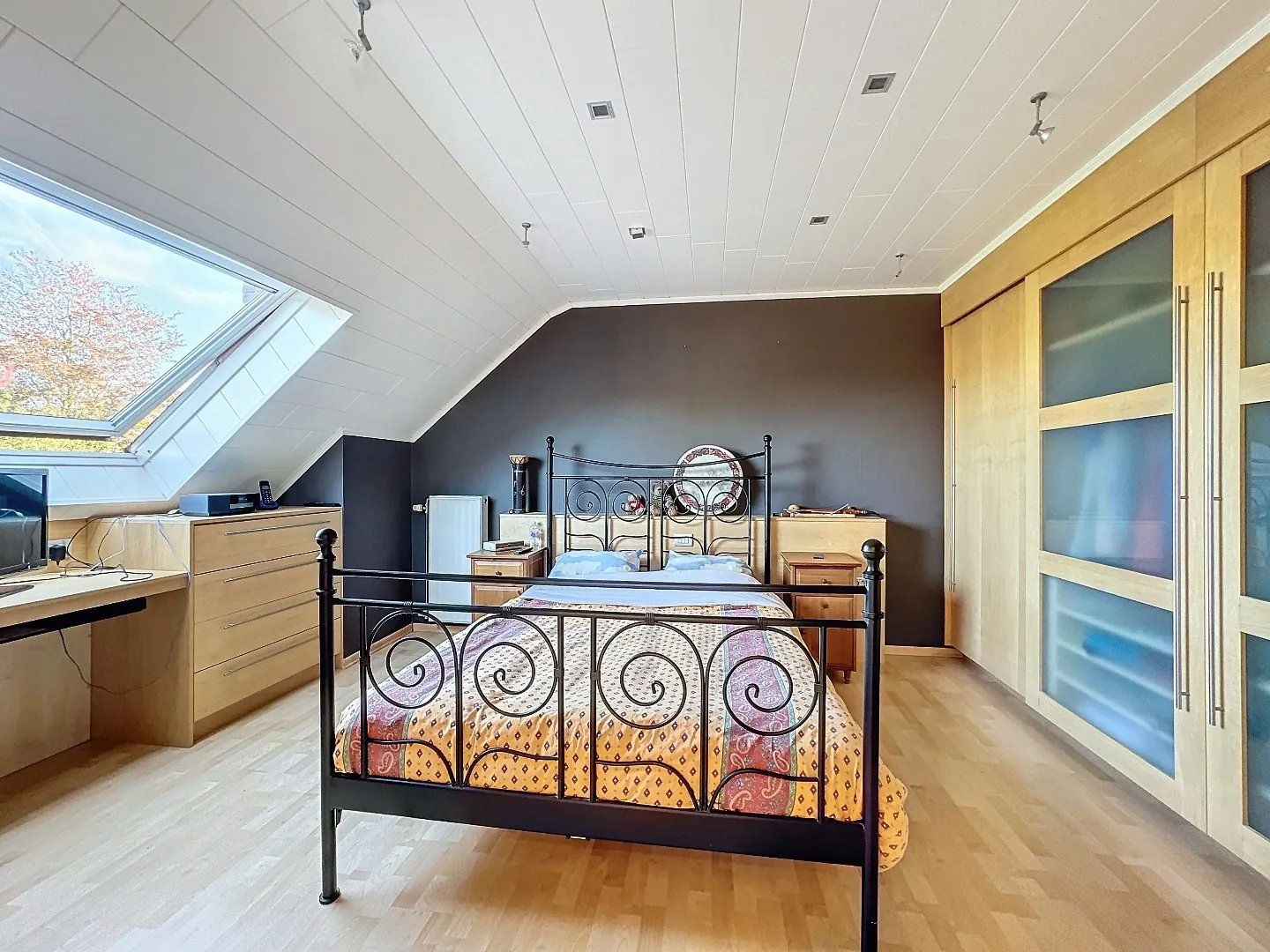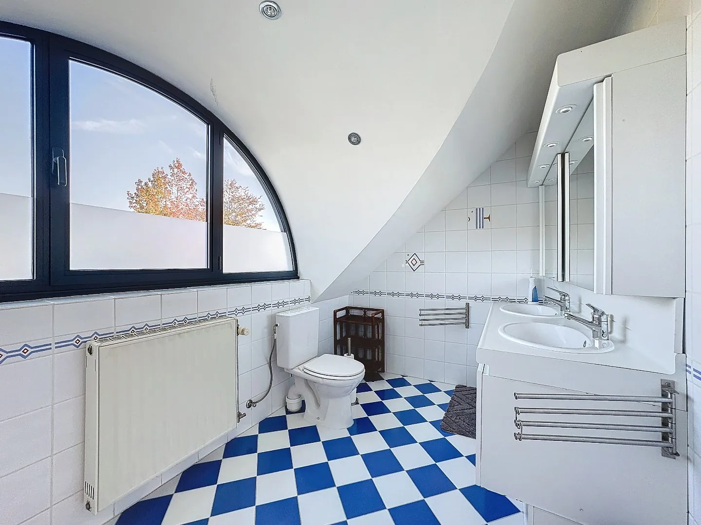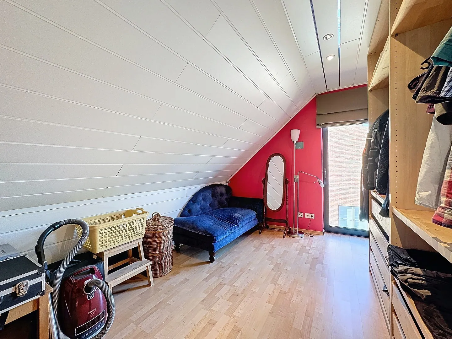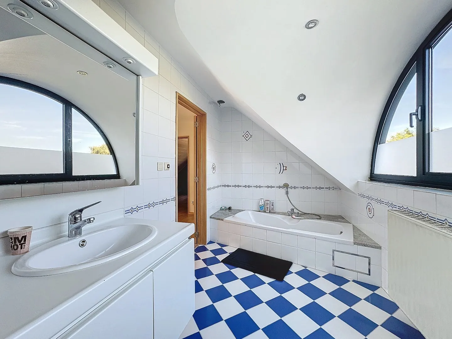 Eerste verdieping: nachthal, 3 slaapkamers, badkamer met ligbad, dubbele lavabo en toilet.