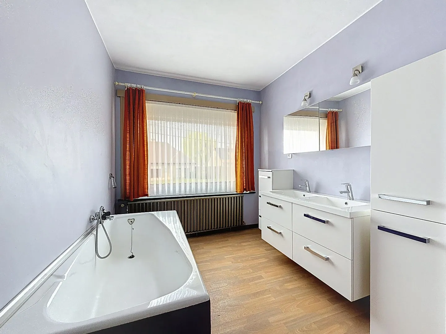 Eerste verdieping: 3 slaapkamers, badkamer met ligbad en dubbele lavabo, afzonderlijk toilet.