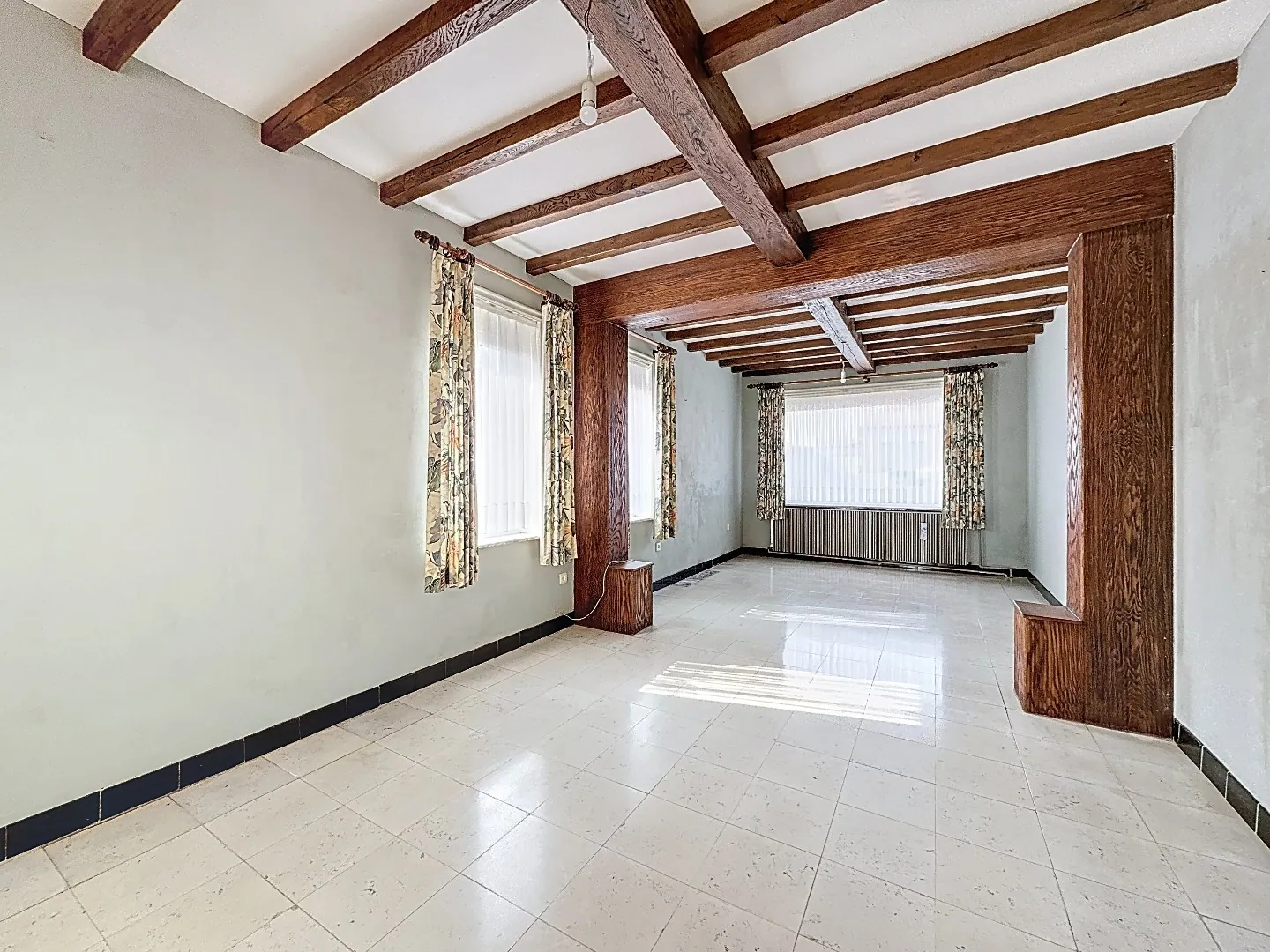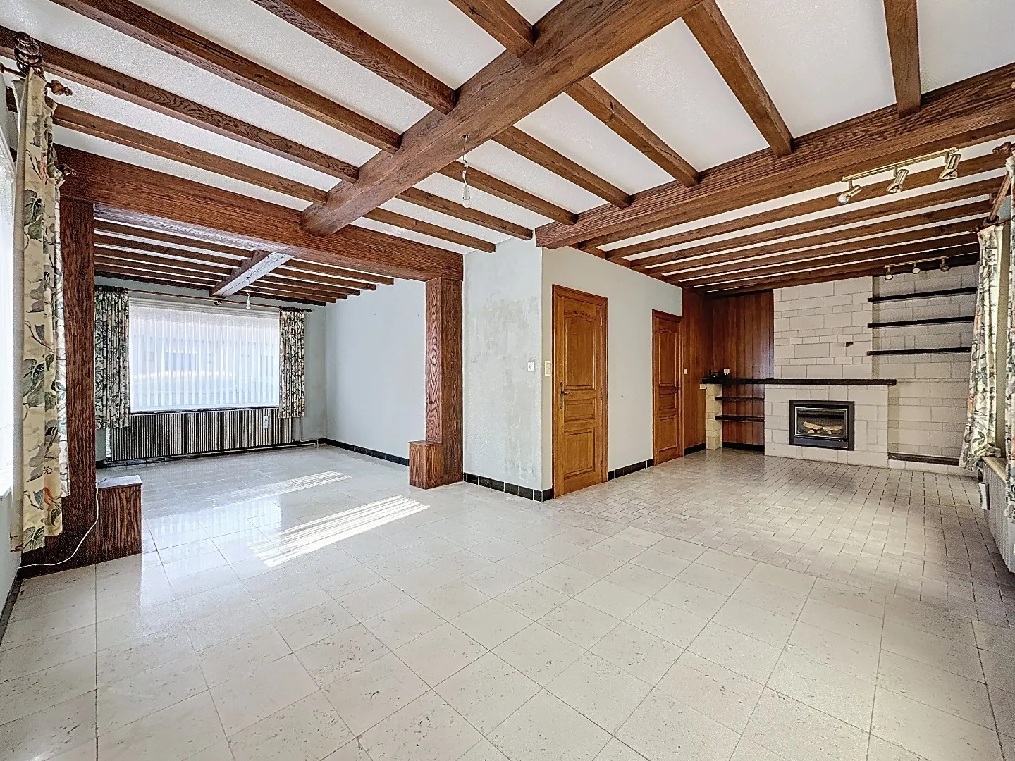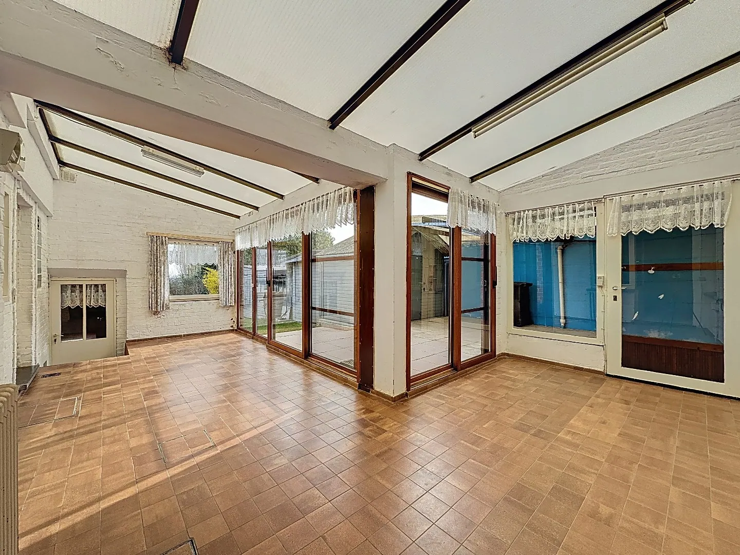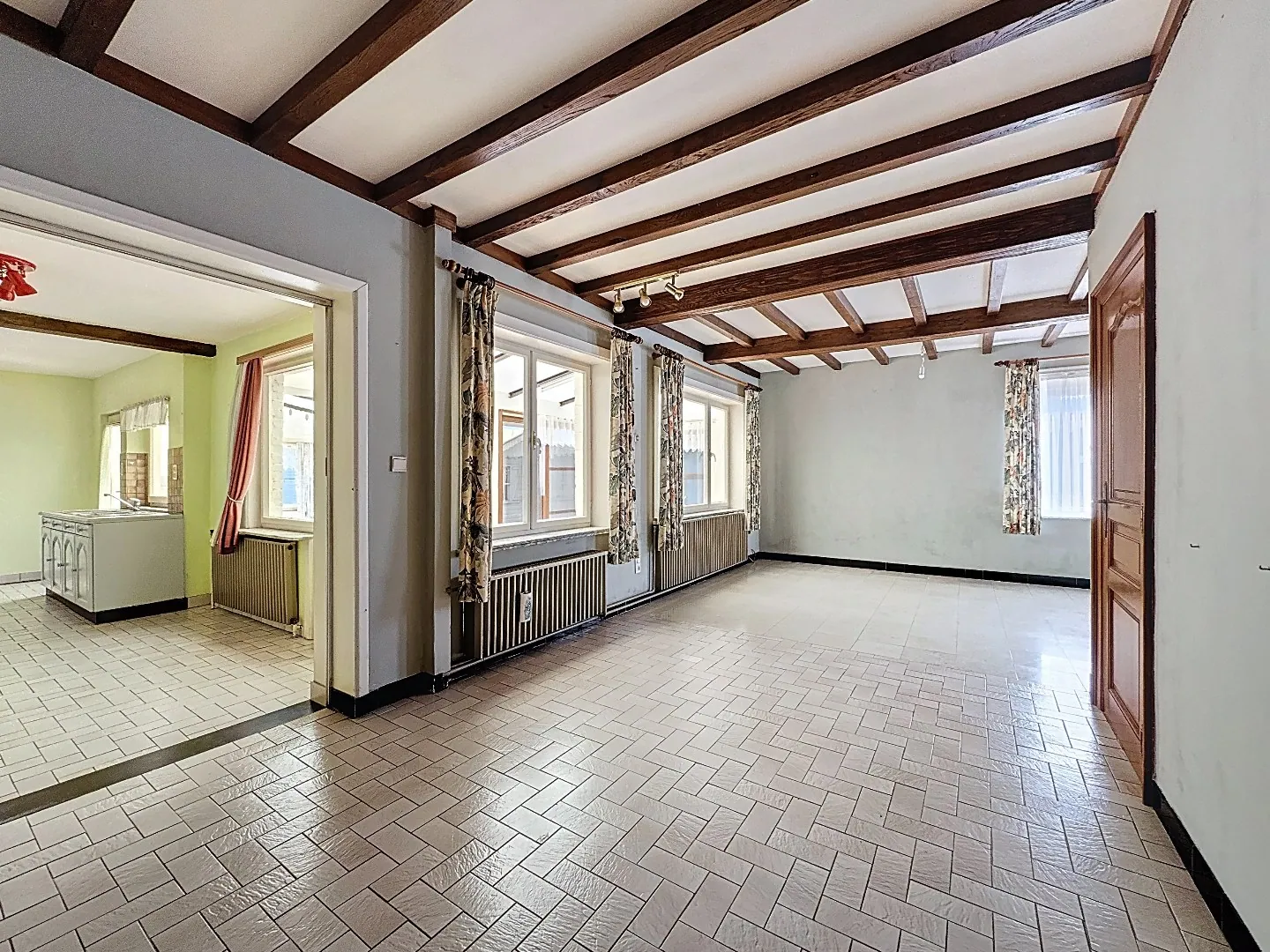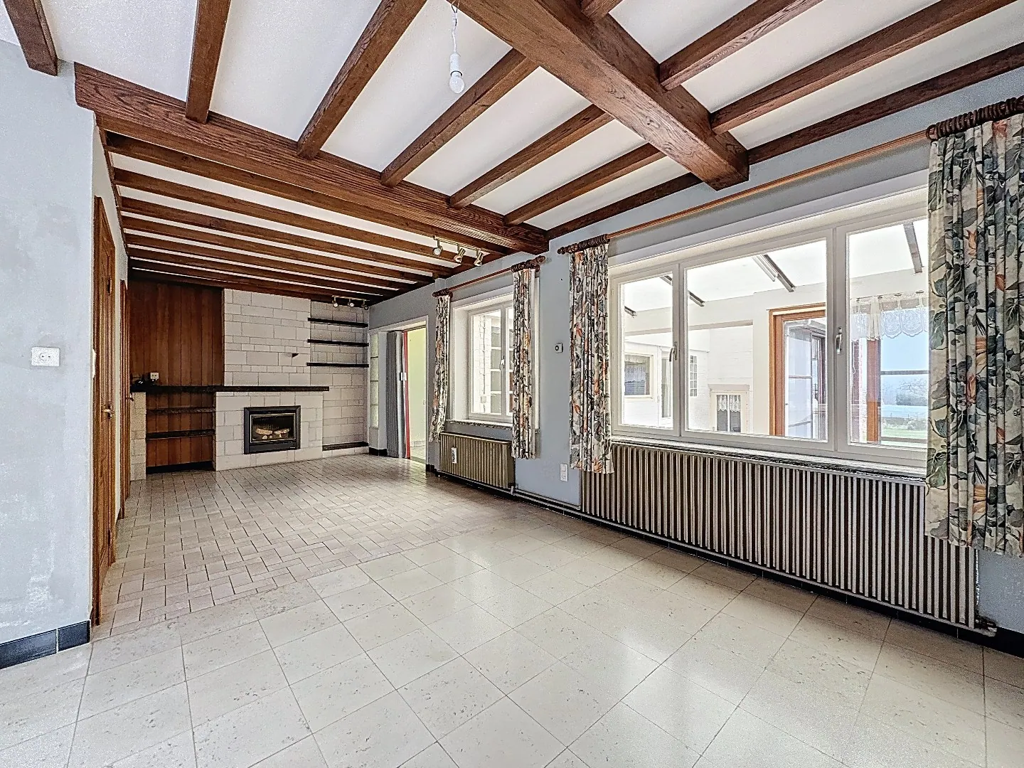 Indeling: inkomhal, grote leefruimte met aansluitende eetplaats, keuken met aanpalend de veranda, toilet, ruim berghuis (met keldertje), garage (eveneens met kelder).
