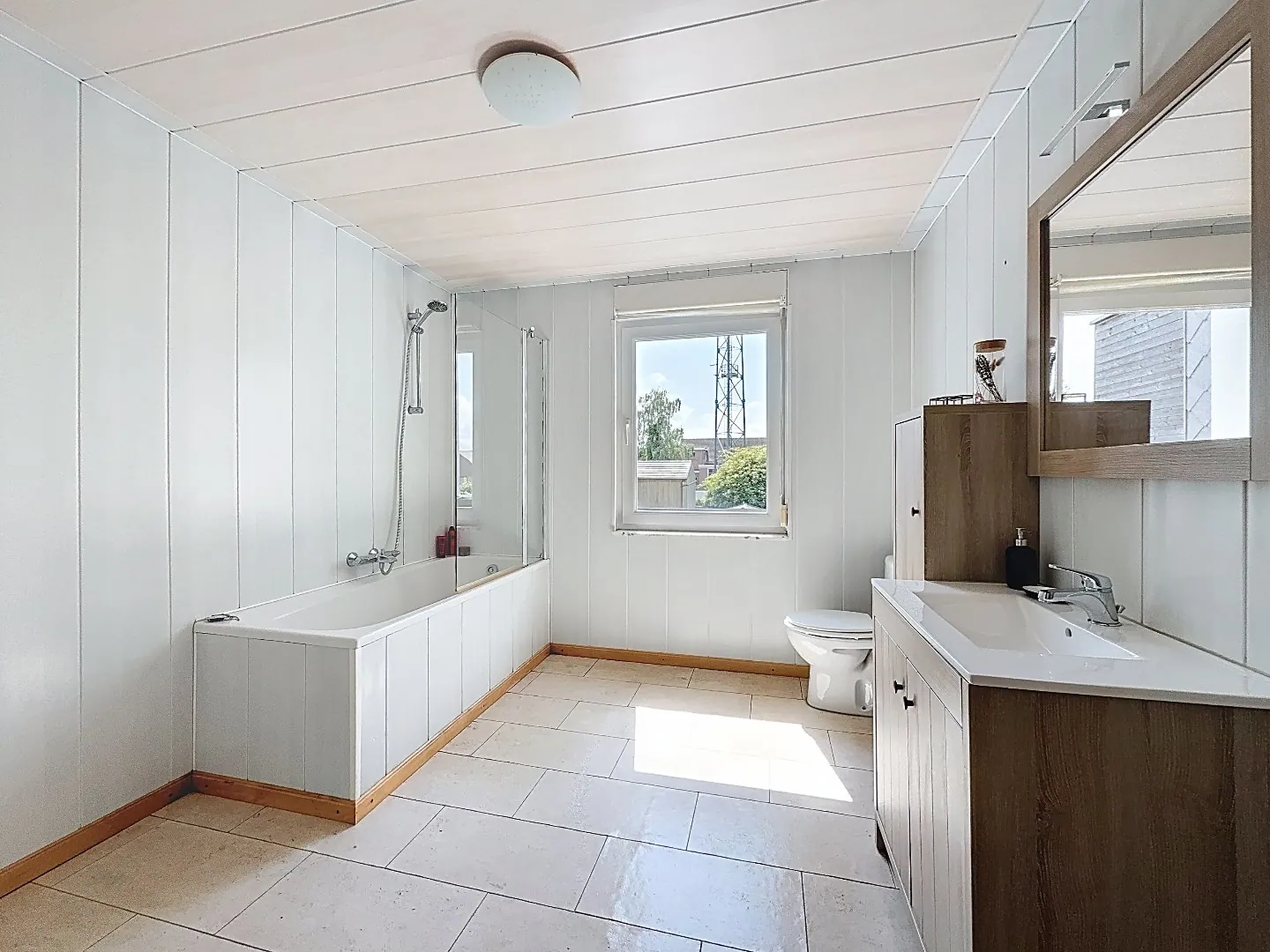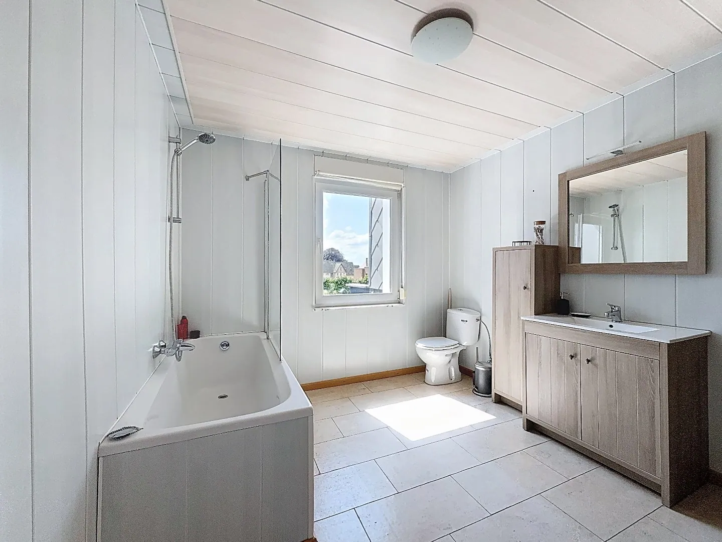 Eerste verdieping: 2 slaapkamers en badkamer met ligbad, lavabo en toilet.