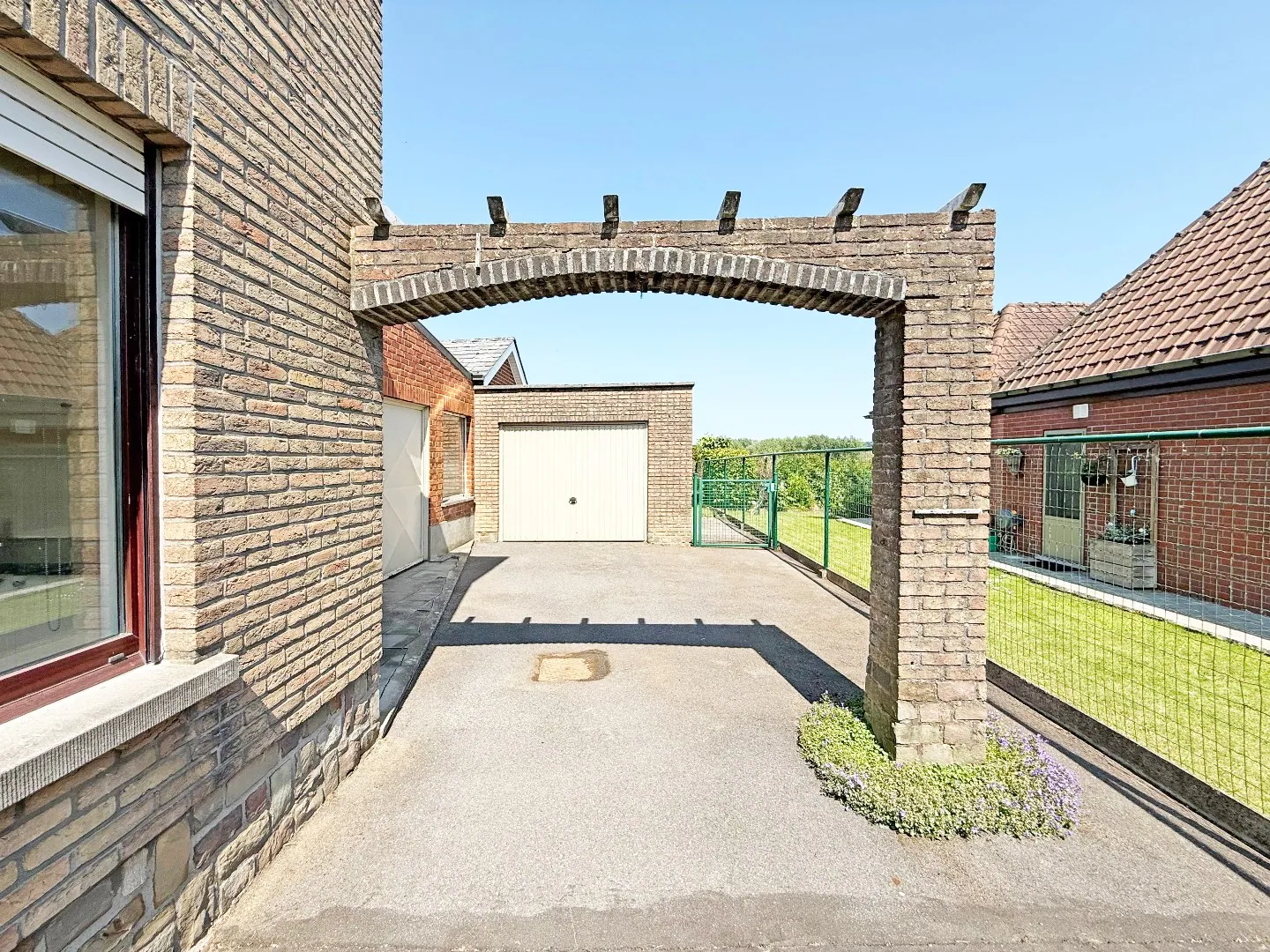 Indeling gelijkvloers: inkomhal, open leefruimte/eetplaats, ruime gesloten keuken, grote stalling met badkamer, bergingen, wasplaats, toilet.