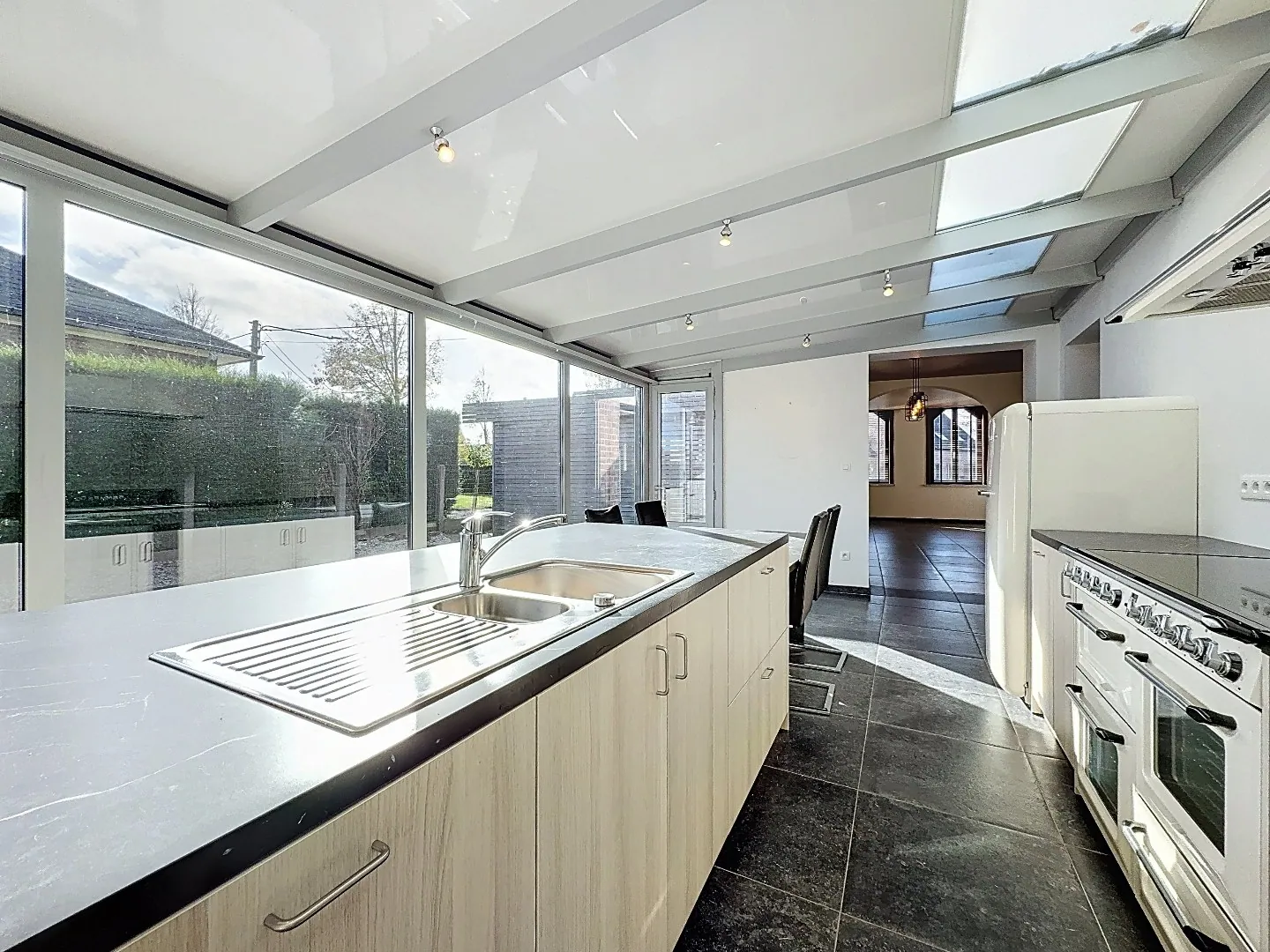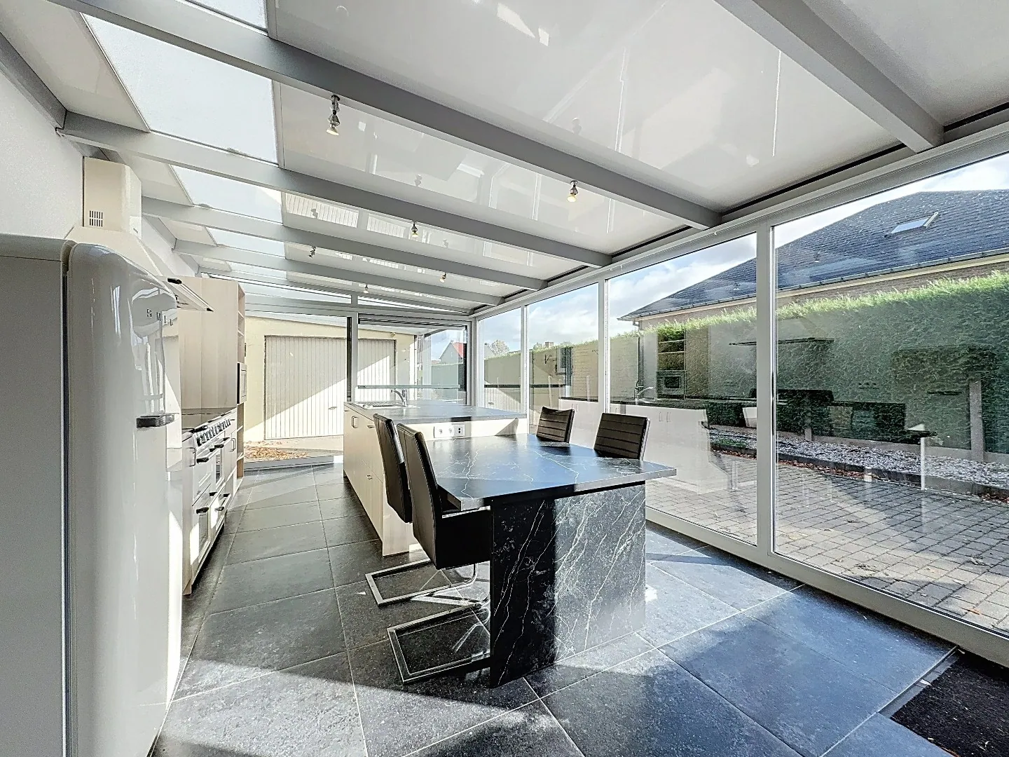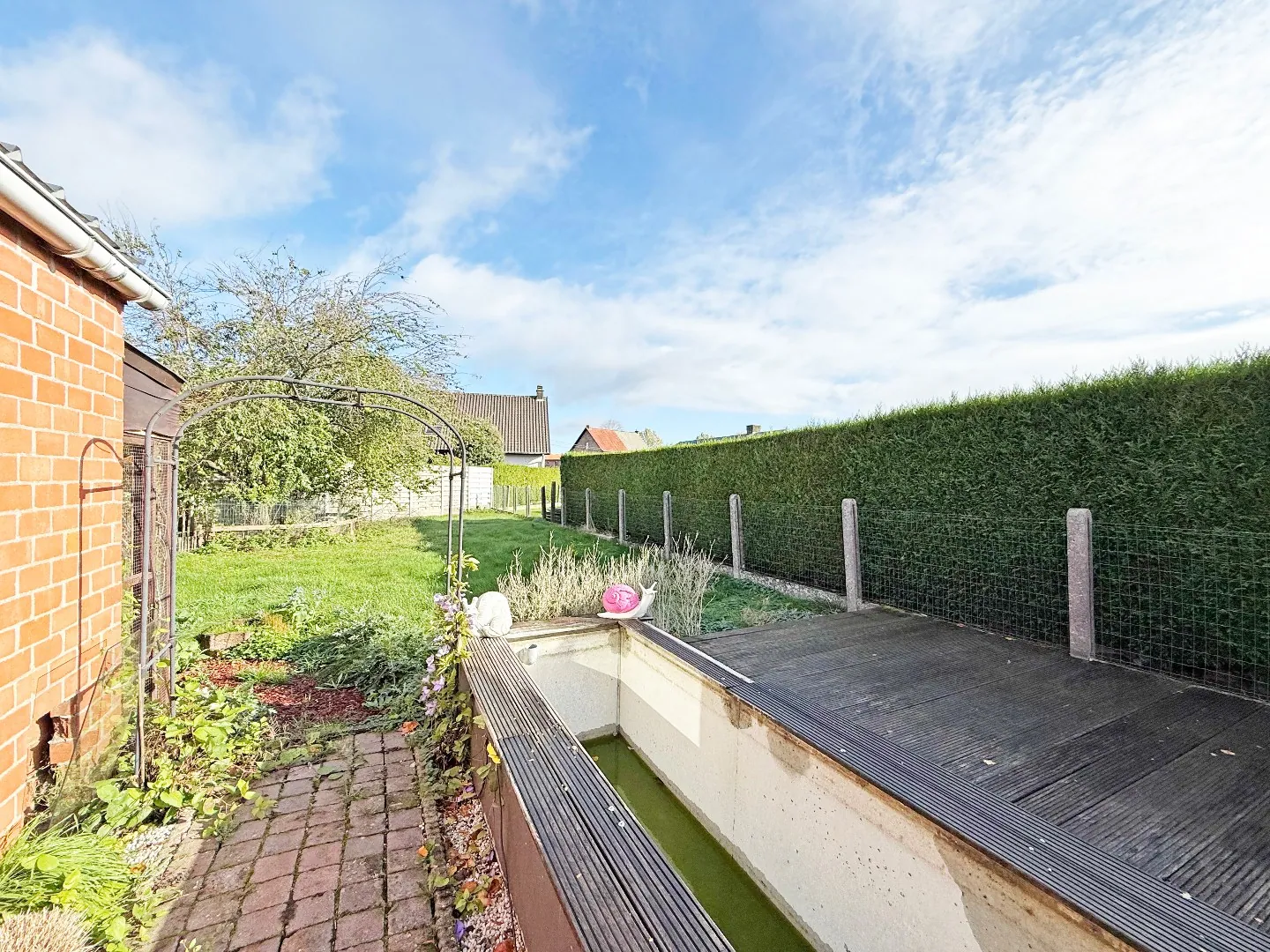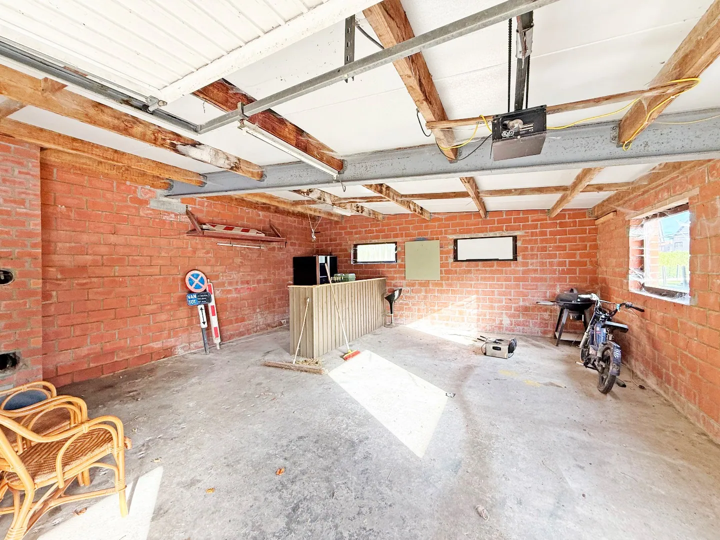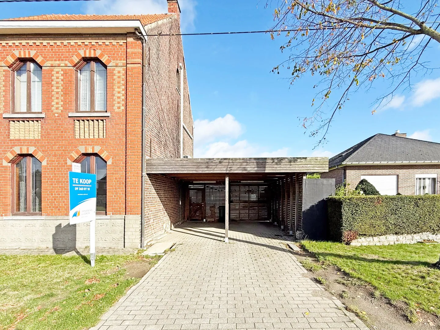 Buiten bevindt zich nog de dubbele carport met doorgang van de straatzijde naar de tuin (via schuifpaneel), ruime oprit, grote afzonderlijke garage/bergplaats, terras, tuin.