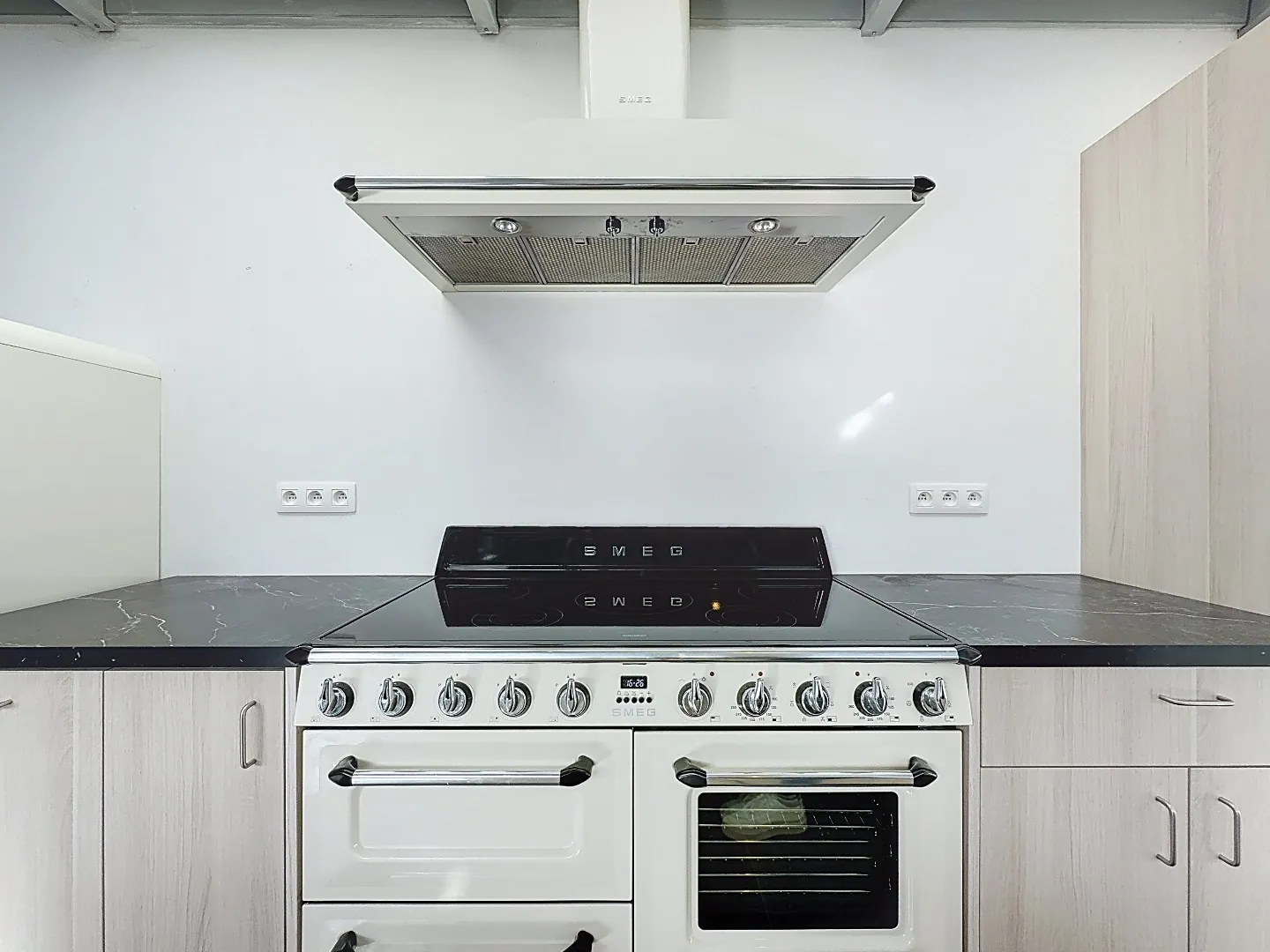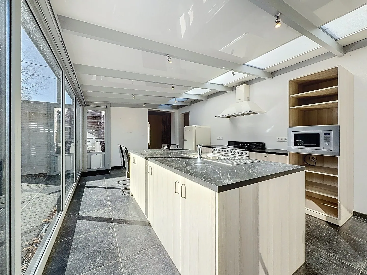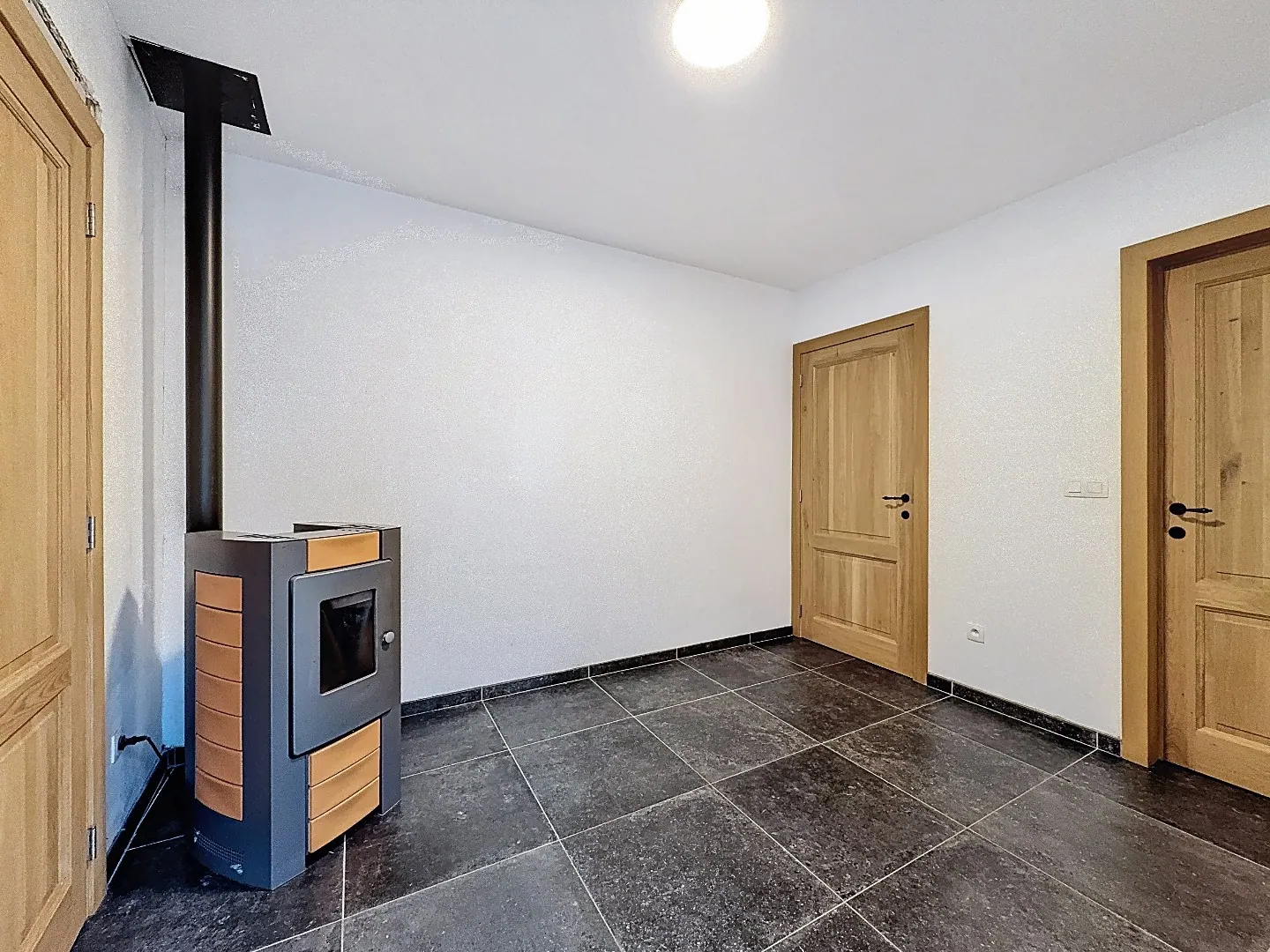 Indeling: inkomhal, gezellige open leefruimte en eetplaats met pelletkachel, lichtrijke geïnstalleerde keuken met SMEG toestellen, tussenruimte met pelletkachel, gastentoilet, knappe badkamer met inloopdouche en lavabo, handige berging/wasplaats met ingemaakte kasten en zoldering.