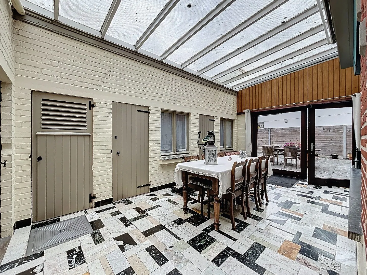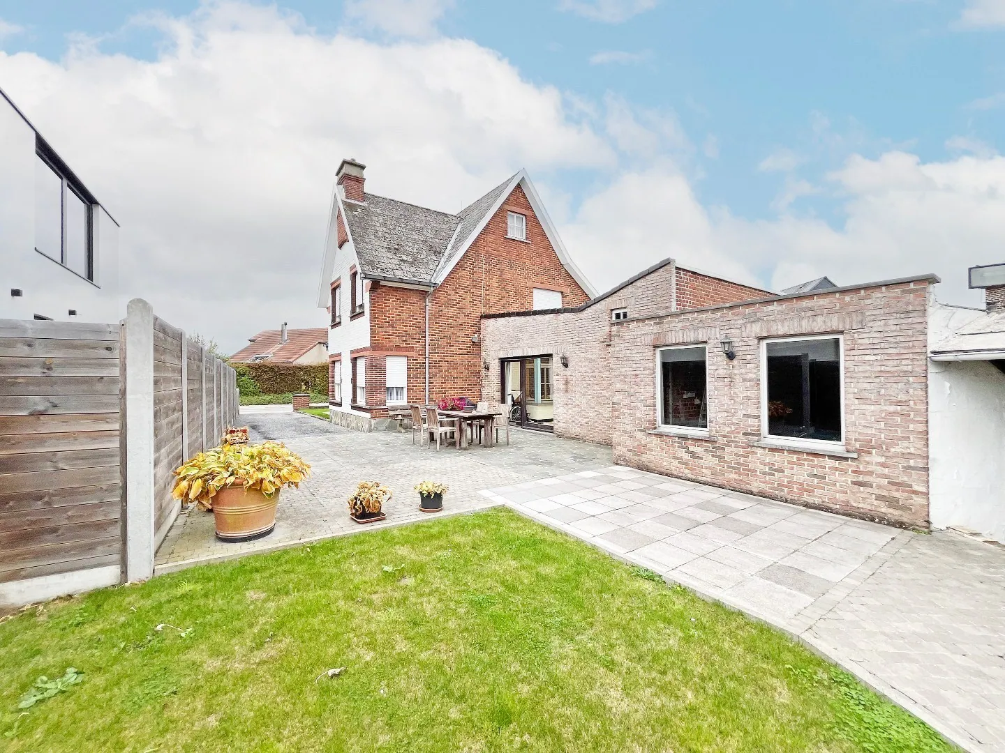 Buiten is er nog het terras, de zuidoost georiënteerde tuin, tal van bergruimtes en garage ... vooraan de woning zijn 2 opritten en aan de zijkant van het perceel is nog een inrit.